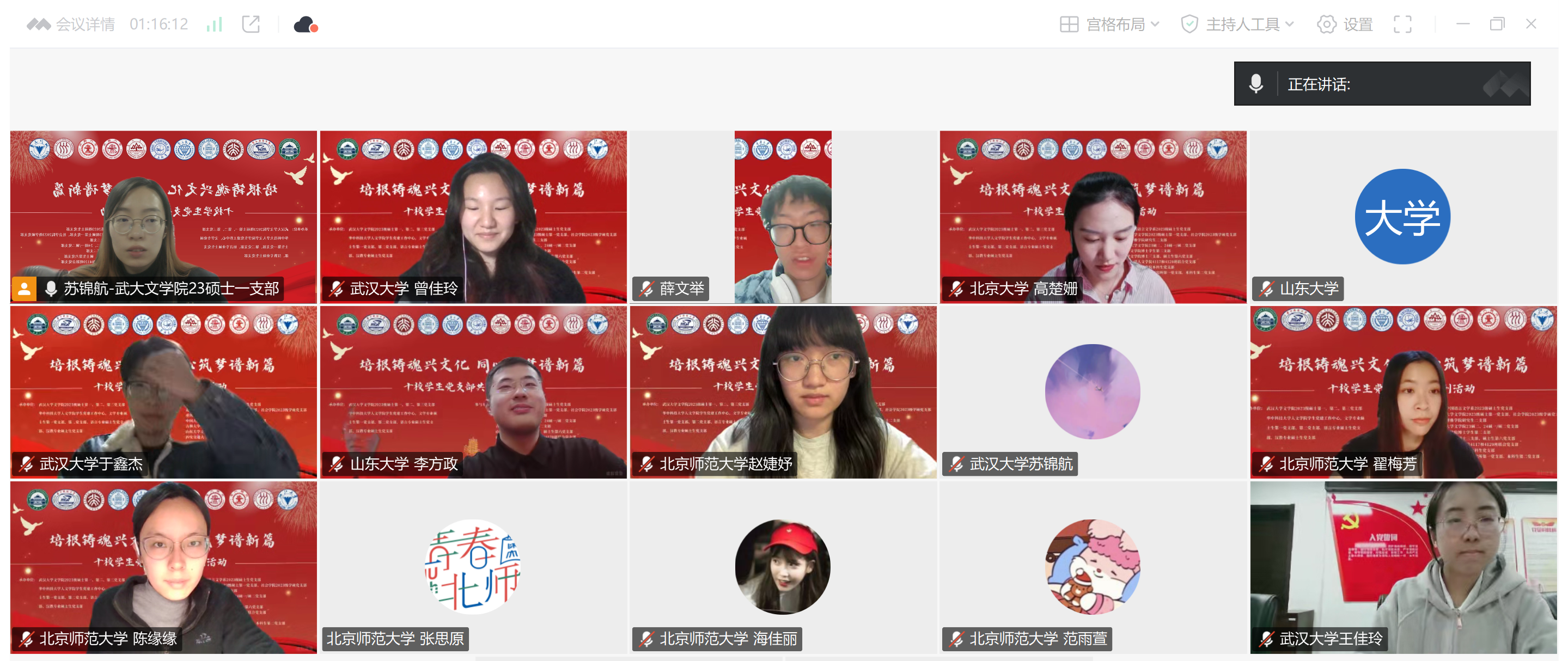2025年3月22日,由武汉大学文学院、华中科技大学人文学院学生党建中心联合主办的“培根铸魂兴文化,同心筑梦谱新篇”系列活动——十校支部工作交流会成功举行。来自10所双一流高校的20个学生党支部、近50位支书及支委参会,共同探讨高校支部学习与育人新模式。文学院2023级硕士第一党支部书记翟梅芳作为代表分享了支部在“三会一课”中的多维一体实施策略,以及与社会学院2023级学硕党支部开展的“联学联建、创新创优”活动,展示了支部在党建工作中的探索与成效。此次主题研讨会为高校党支部提供了交流与合作的平台,进一步增强了学生党员骨干的工作能力。