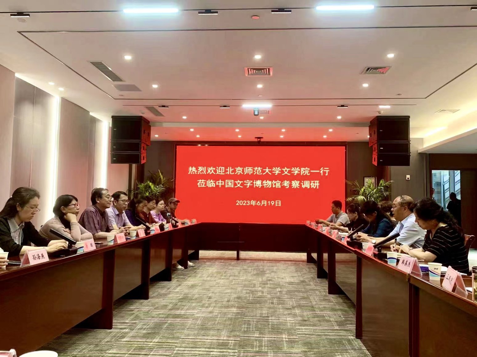 19日上午,中国文字博物馆党委书记、常务副馆长刘纪献以及博物馆有关领导参加专题座谈会。中国文字博物馆是经国务院批准建设的,集文物保护、陈列展示和科学研究为一体的国家一级博物馆,是中华汉字文化的科普中心、全国科普教育基地、爱国主义教育基地。王宁先生领衔的古代汉语教师团队与中国文字博物馆有着长期合作,先后参与中国文字博物馆一期工程和续建工程基本陈列大纲等工作。刘纪献书记介绍了博物馆发展建设的重要历程,以及当下开拓研学、专家讲堂等全新学习方式,力求推动甲骨文普及,推动汉字精神与红色文化相结合。文学院院长王立军强调中国文字博物馆的知识性与品牌力,对博物馆取得的重要成就予以高度评价。党委书记周云磊向与会领导介绍北师大中文学科,特别是近些年来围绕语言文字开展的社会服务工作,期待未来两家单位能够继续合作,为推动国家重大发展战略作出更大的贡献。双方表示,后续将坚持资源共享、加强合作,共同致力于语言文字的推广和普及,更好地传承弘扬中华优秀传统文化,为坚定文化自信、推动文化繁荣、建设文化强国、建设中华民族现代文明作出贡献。