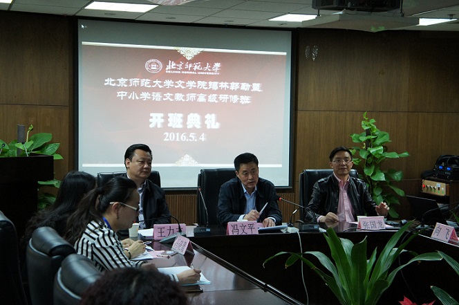 2016年5月4日星期三上午8时30分,北京师范大学文学院内蒙古锡林郭勒盟中小学语文教师高级研修班开班典礼于北京师范大学主楼7层励耘报告厅顺利召开。北京市教委办公室副主任王力志、内蒙古锡林郭勒盟教育局副局长冯文平、内蒙古锡林郭勒盟教育局师资科冯晓蕾、北京师范大学文学院发展合作中心主任张国龙出席此次开班典礼,北京师范大学文学院发展合作中心副主任向飞负责主持此次典礼。