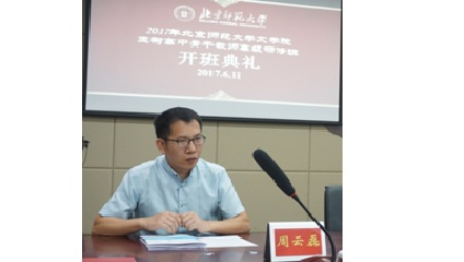 北京师范大学文学院副书记周云磊首先代表培训方致欢迎辞,他为大家简要介绍了北师大文学院的历史沿革和特色成就,表示要为参训老师们提供便利、做好服务,并衷心祝愿各位学员在培训期间生活舒心、交流称心、活动开心!