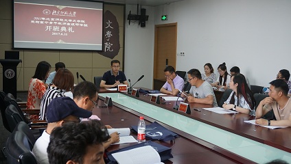 2017年6月11日上午,为期15天的玉树州高中骨干教师高级研修班开班典礼在北京师范大学文学院隆重举行。北京师范大学文学院党委副书记周云磊,玉树州教育局党组成员、副局长王鸿杰,文学院发展合作中心主任向飞,来自玉树州民族中学、第二民族高级中学、第三民族高级中学三所学校的37名高中教师出席。