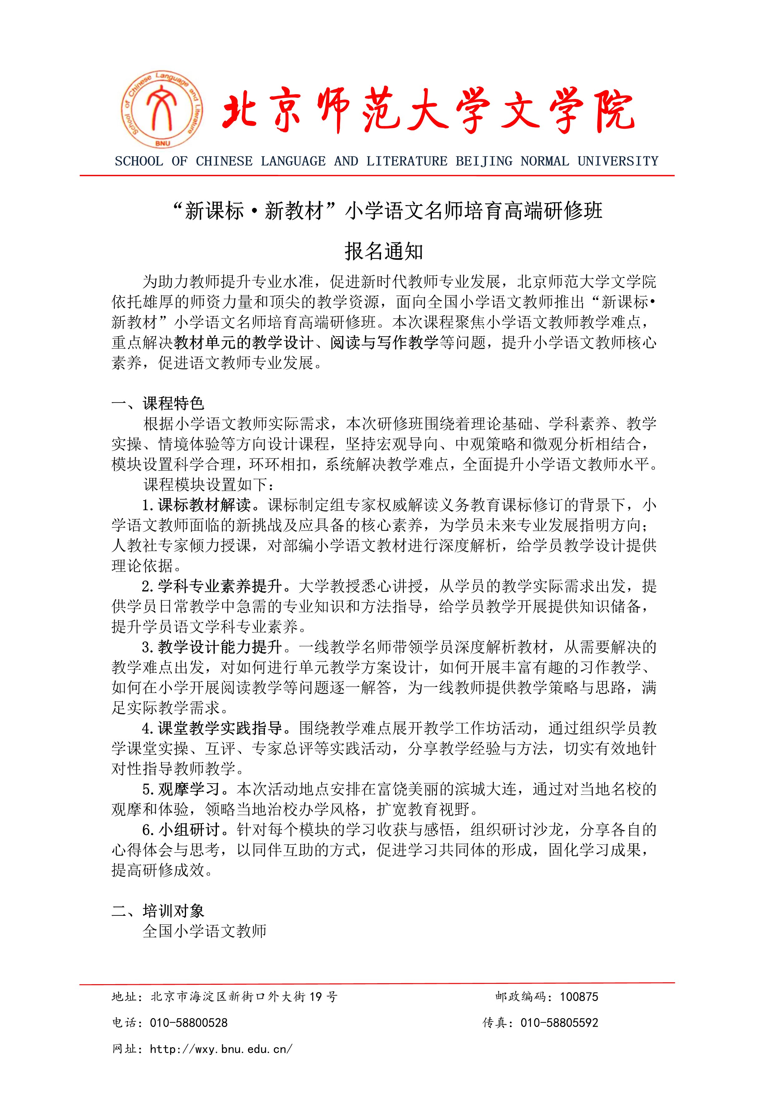 “新课标•新教材”小学语文名师培育高端研修班报名通知