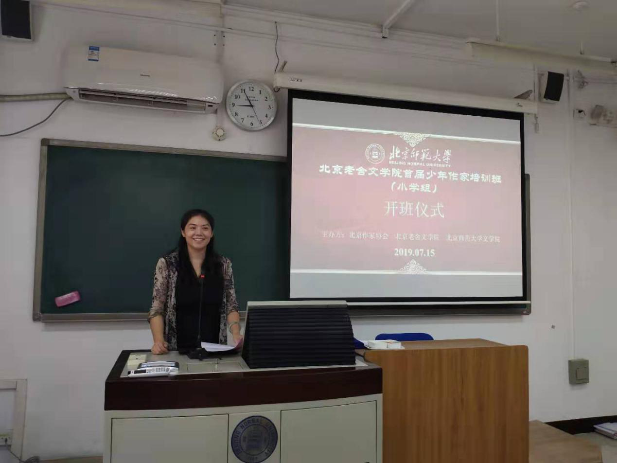 白靖毅老师首先对北京师范大学文学院为本次活动的默默付出表示了衷心的感谢。其次,她对北京老舍文学院作了简要的介绍。她指出,北京老舍文学院最大的职能是承担北京市文学人才培养和文学创作的指导工作,它的视野不止局限于成年人,更关注梯队建设,即不同年龄层的作家培养,而本次培训班的学员是梯队建设中最年轻的一批。她希望大家能通过本次培训学习更多创作方法,提升文学素养,能用富有少年气却不稚嫩的文笔去书写北京。最后,作为主办方之一,她对学员提出了学习要求,这些要求都寄予了她对学员们殷切的关怀和期望。