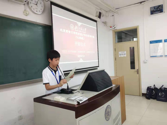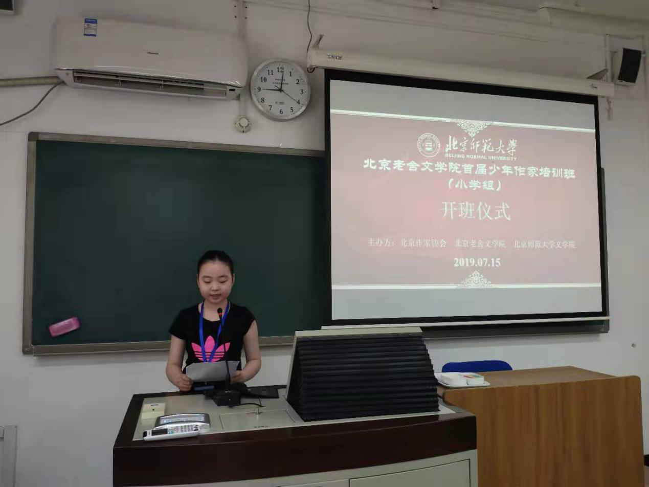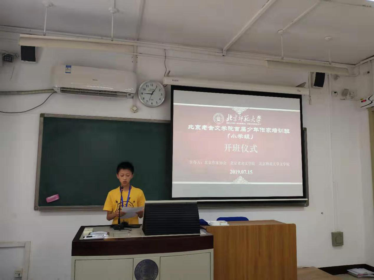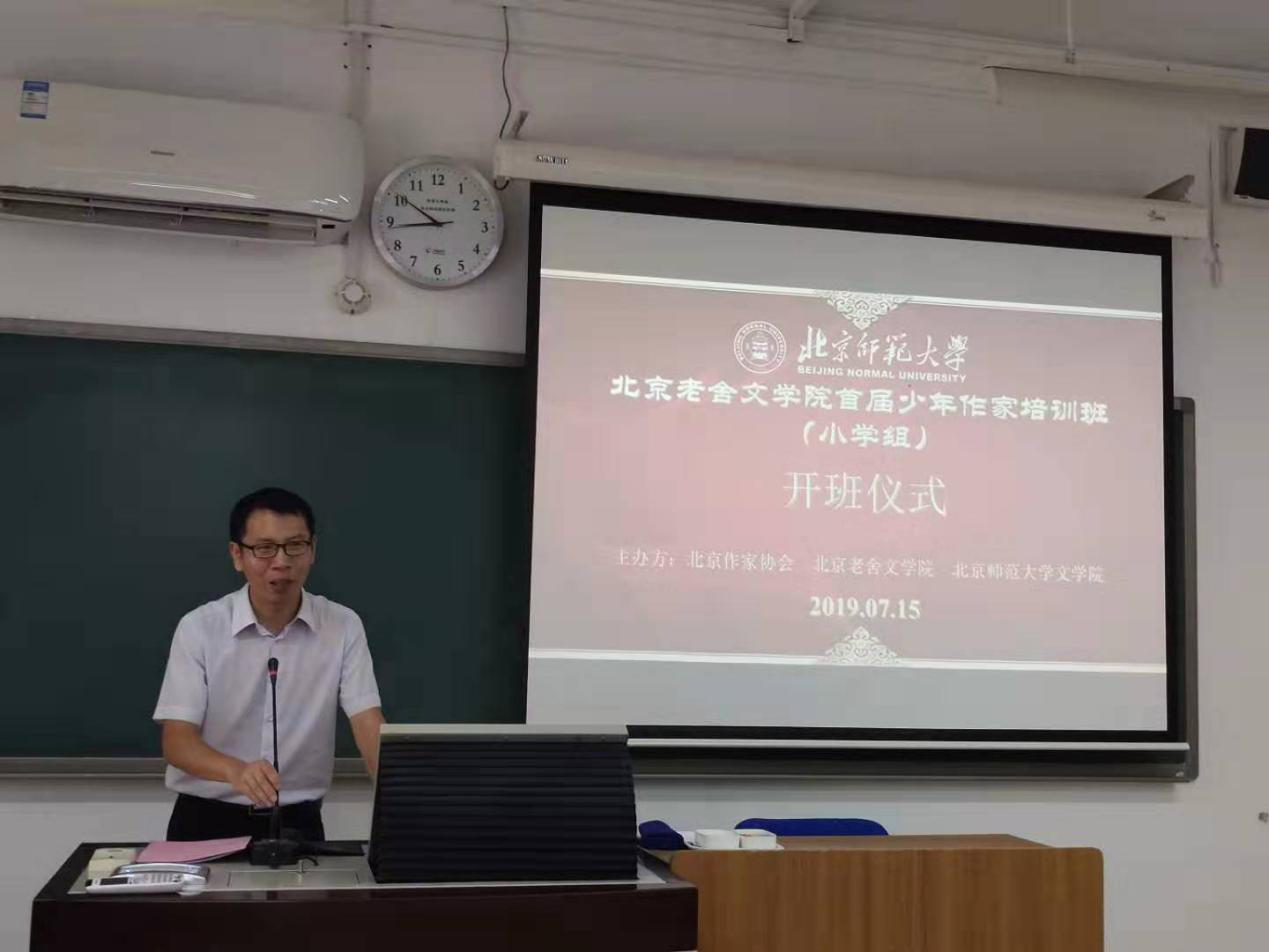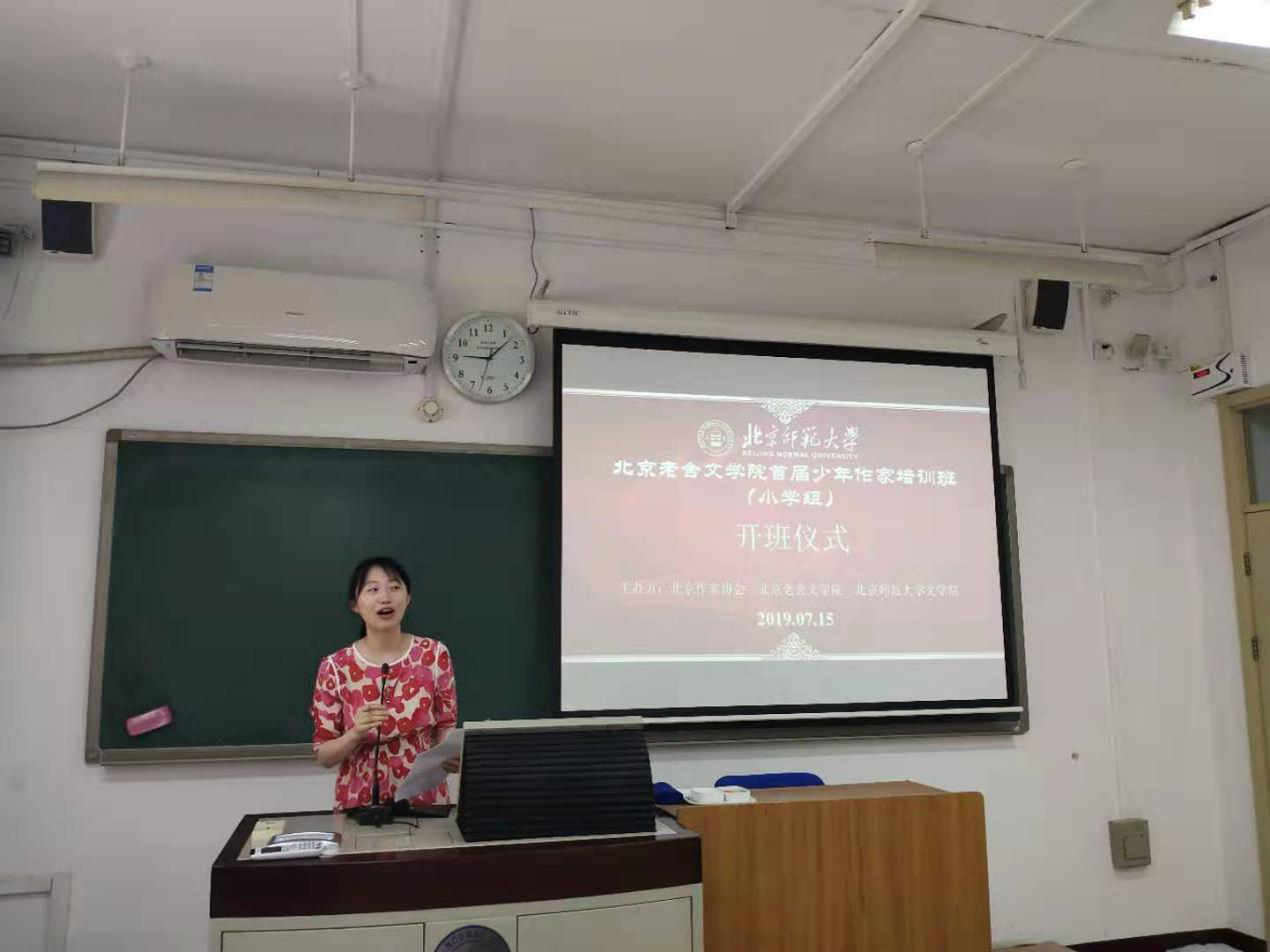 2019年7月15日上午9点,北京师范大学2019年北京老舍文学院首届少年作家培训班(小学组)开班仪式于北京师范大学教二111举行。此次开班仪式由北京师范大学文学院邢楷老师主持,北京市文联副主席白靖毅、北京小作家协会秘书长周敏、北京师范大学文学院分党委副书记周云磊、北京师范大学文学院发展与合作中心主任向飞出席了此次开班仪式。