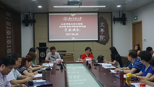 2017年6月20日上午9点,北京师范大学文学院-兰州市民族教师高级研修班开班仪式于北京师范大学主楼C区5049顺利召开。此次开班典礼北京师范大学文学院发展合作中心副主任张帆主持,兰州市民族宗教委政法处处长蔺雪琰、兰州市教育局基教二处副处长周雯、兰州市民族宗教委文教处副处长杜强、北京师范大学文学院分党委副书记周云磊、北京师范大学文学院发展与合作中心执行主任向飞出席了开班典礼。