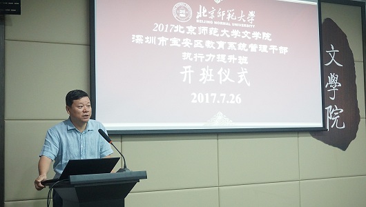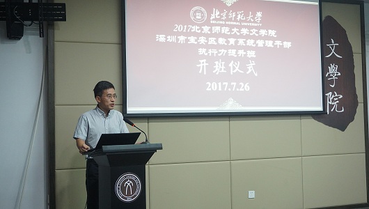 之后,深圳市宝安区教育发展事务中心温福华主任代表学员感谢深圳市宝安区教育局、北师大文学院给予本次培训的大力支持。此次外出培训机会宝贵,学员们一定要珍惜培训机会,一要认真聆听大师学者们的讲座,二是在座的各位学员要多多交流,三要好好感受首都和北师大的人文气息,相信此行一定会学有所获。北京师范大学文学院发展合作中心执行主任向飞对此次研修期间的培训具体安排进行了补充。
