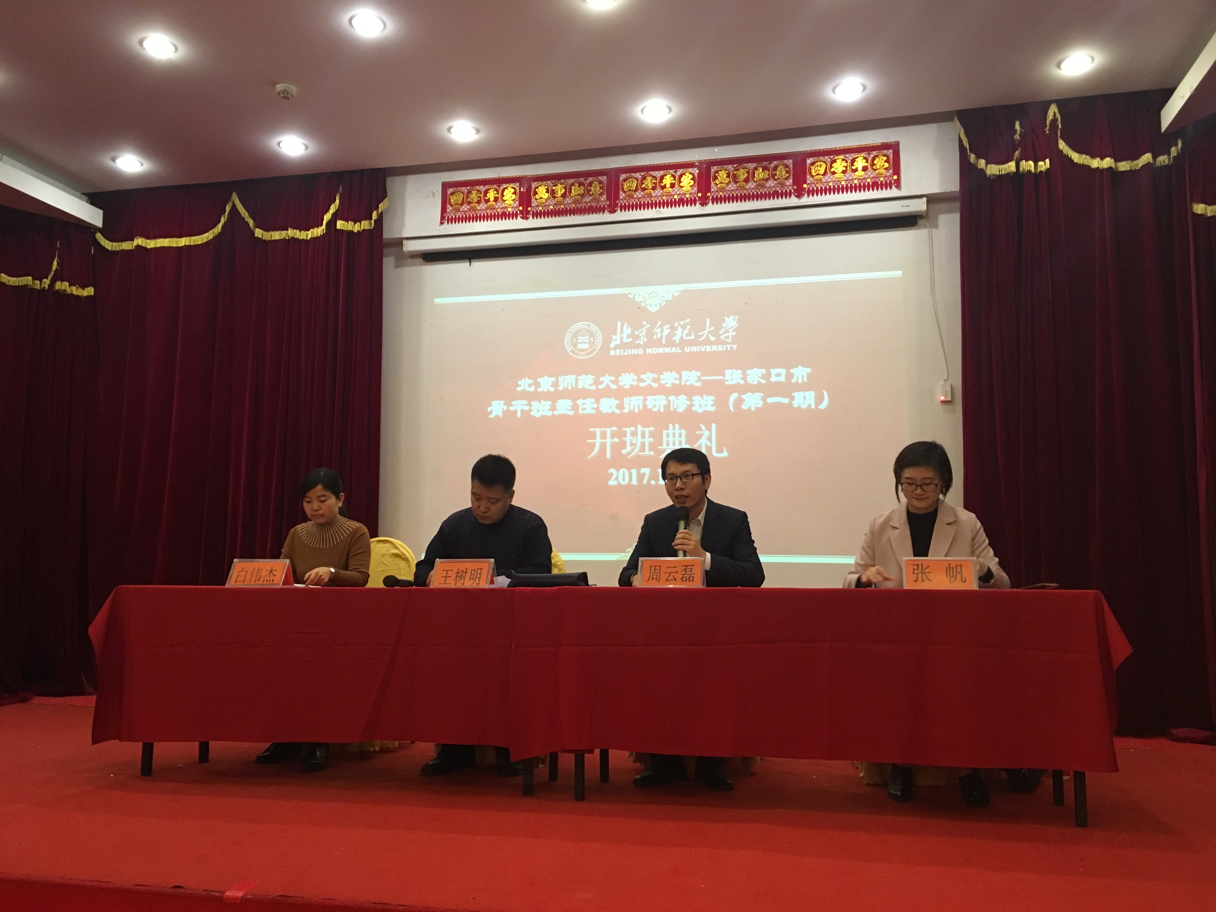 2017年12月18日星期一上午八点三十分,北京师范大学文学院张家口市骨干班主任教师研修班(第一期)开班典礼于北京天方饭店三层多功能厅顺利召开。此次典礼由北京师范大学文学院发展与合作中心副主任张帆主持,张家口市教育局教科所副所长王树明以及北京师范大学文学院党委副书记周云磊出席了此次开班典礼。