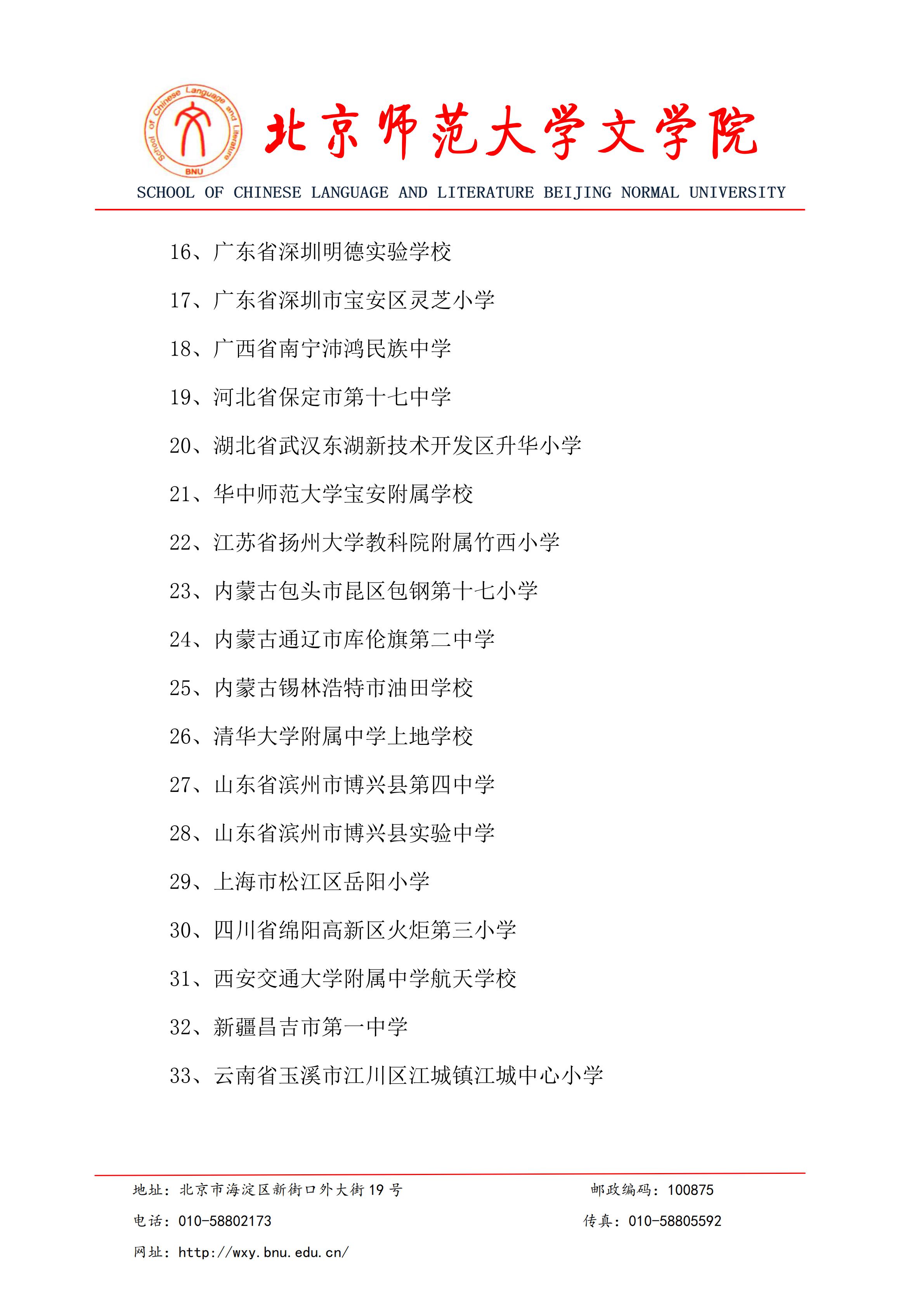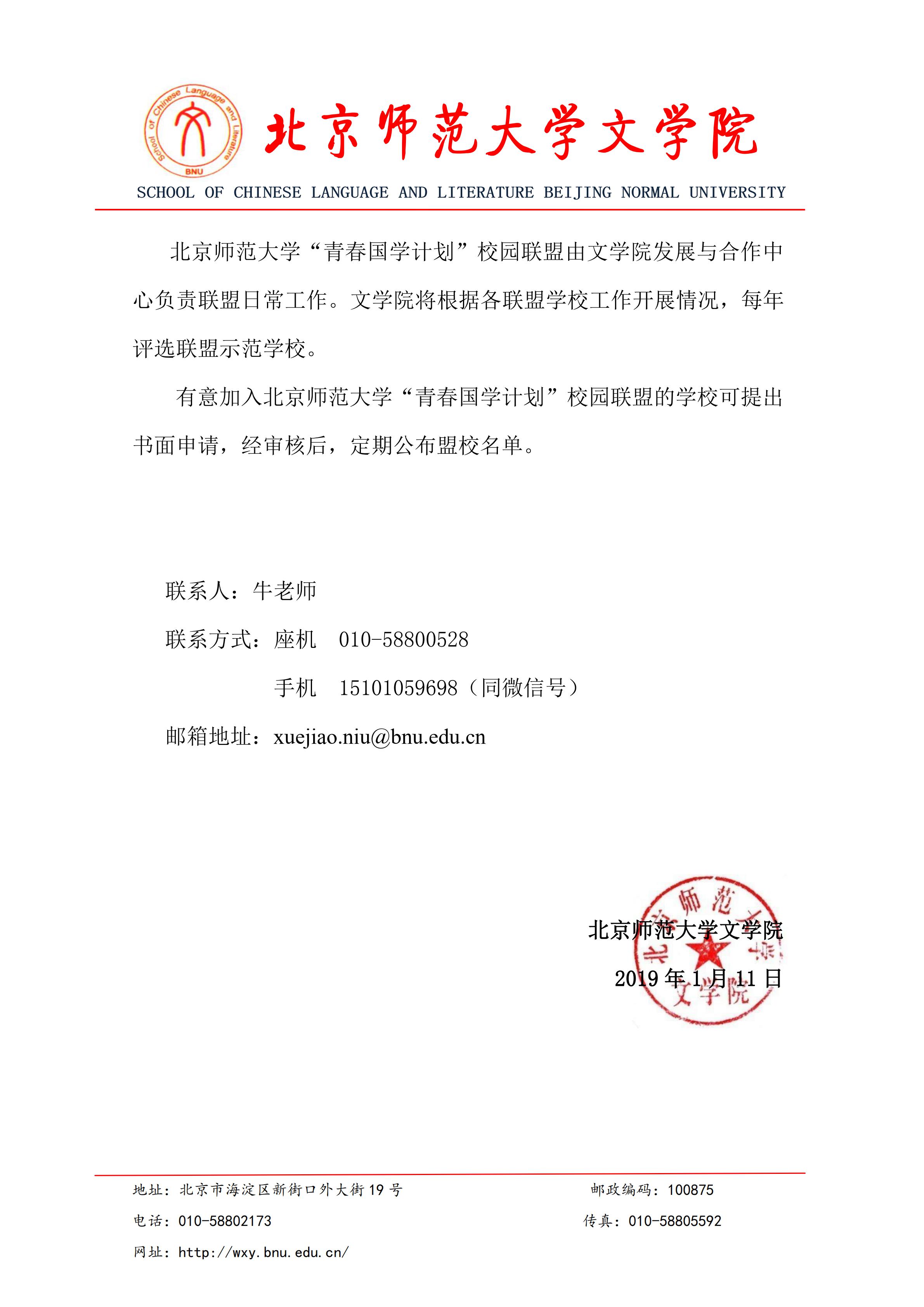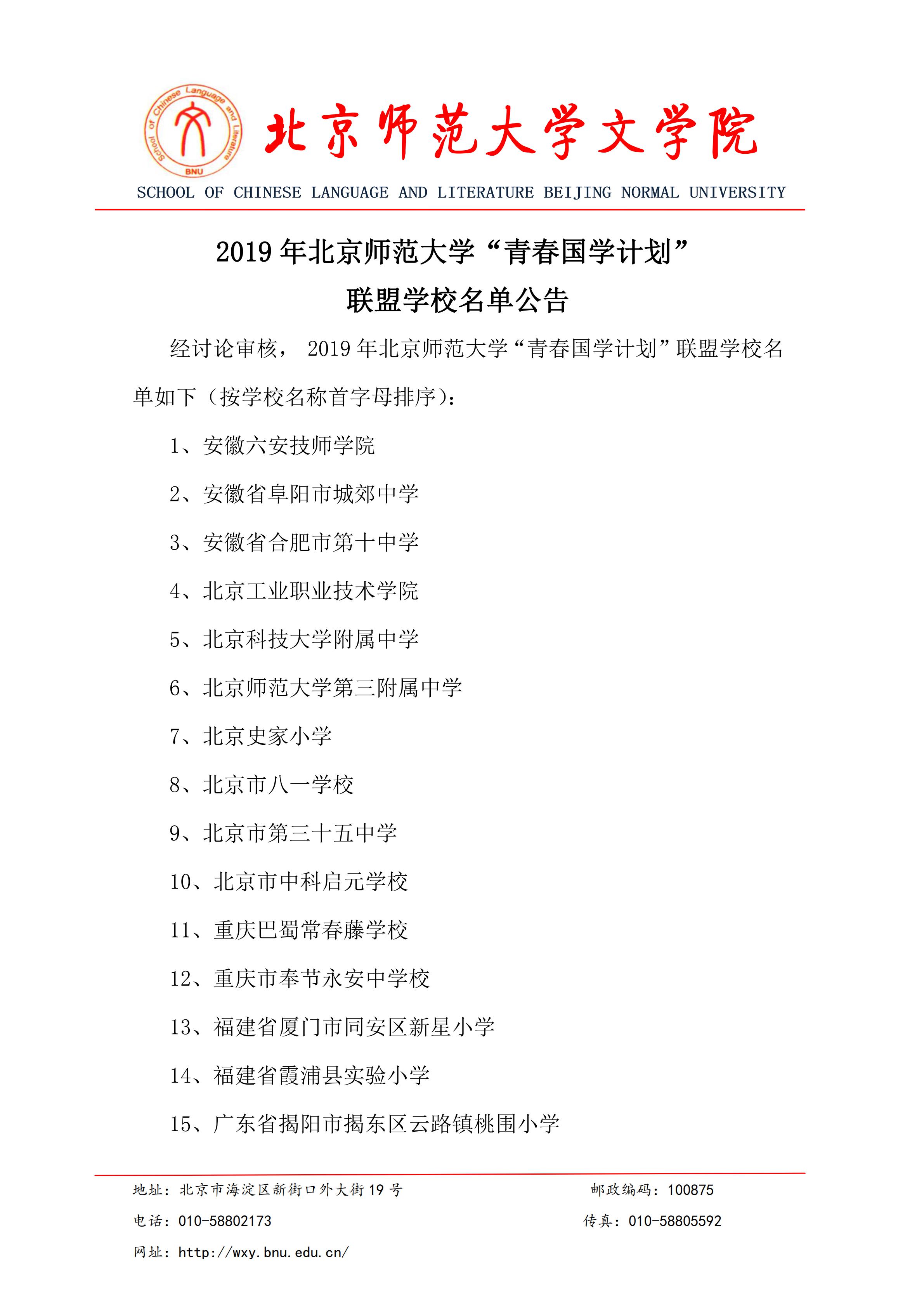 2019年北京师范大学“青春国学计划”联盟学校名单公告