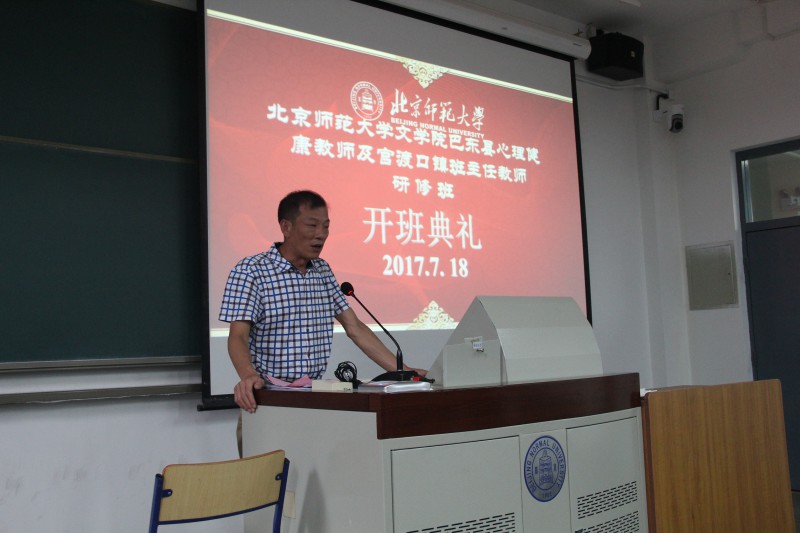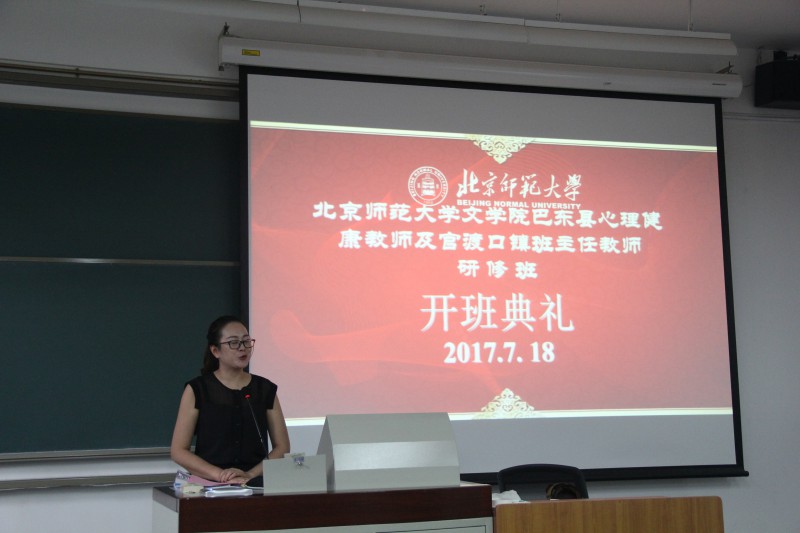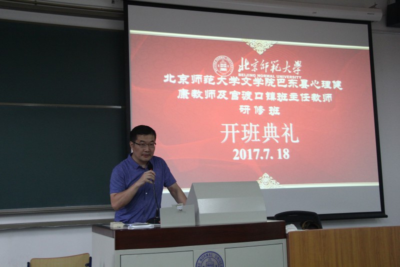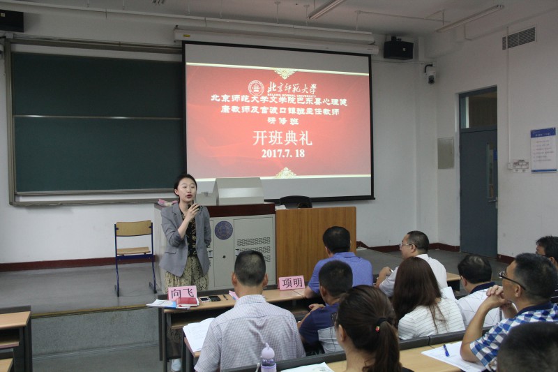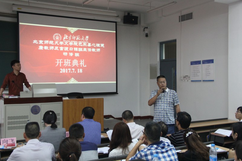 2017年7月18日上午,湖北省巴东县心理健康教师及官渡口镇班主任教师研修班开班典礼,在北京师范大学教七楼101教室举行。巴东县教育局副局长项明、人事科副科长杜成意,北师大文学院发展与合作中心执行主任向飞出席,来自巴东县当地中小学的90名心理健康教师和班主任参加了典礼。