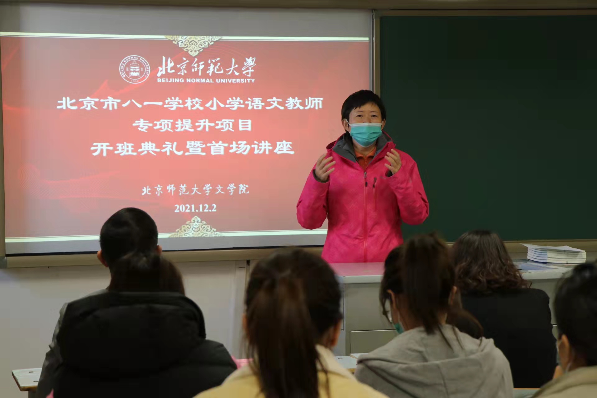 近日,北京师范大学-北京市八一学校小学语文教师专项提升项目开班典礼暨首场讲座在北京市八一学校举行。北京市八一学校牛震云书记,北京师范大学文学院张国龙教授,发展与合作中心张帆、王延荣以及八一学校30位一线小学语文教师参加了本次活动。活动由北京师范大学文学院发展与合作中心副主任张帆主持。