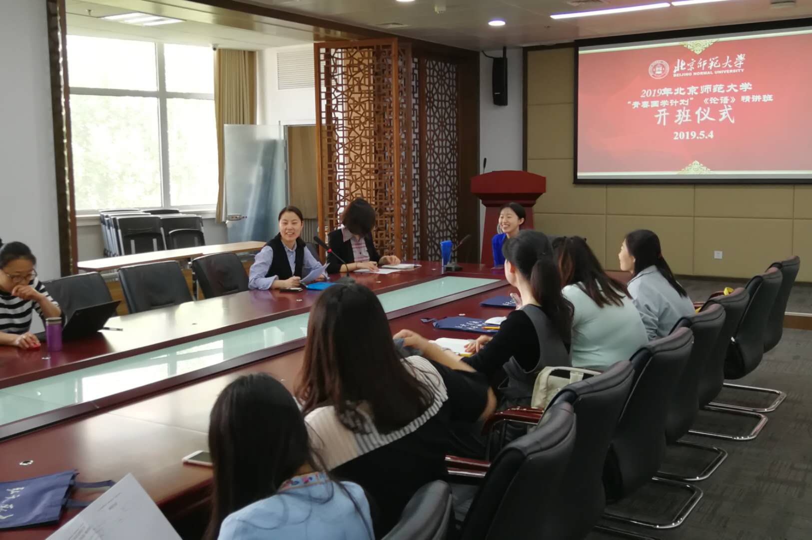 2019年5月4日上午8点半,北京师范大学“青春国学计划”《论语》精讲班开班仪式在北京师范大学本部主楼C 区5049顺利召开。我院发展与合作中心的老师与来自北京市八一学校、北师大三附中、北京市广渠门中学等京内外的中学语文教师参加了开班仪式。