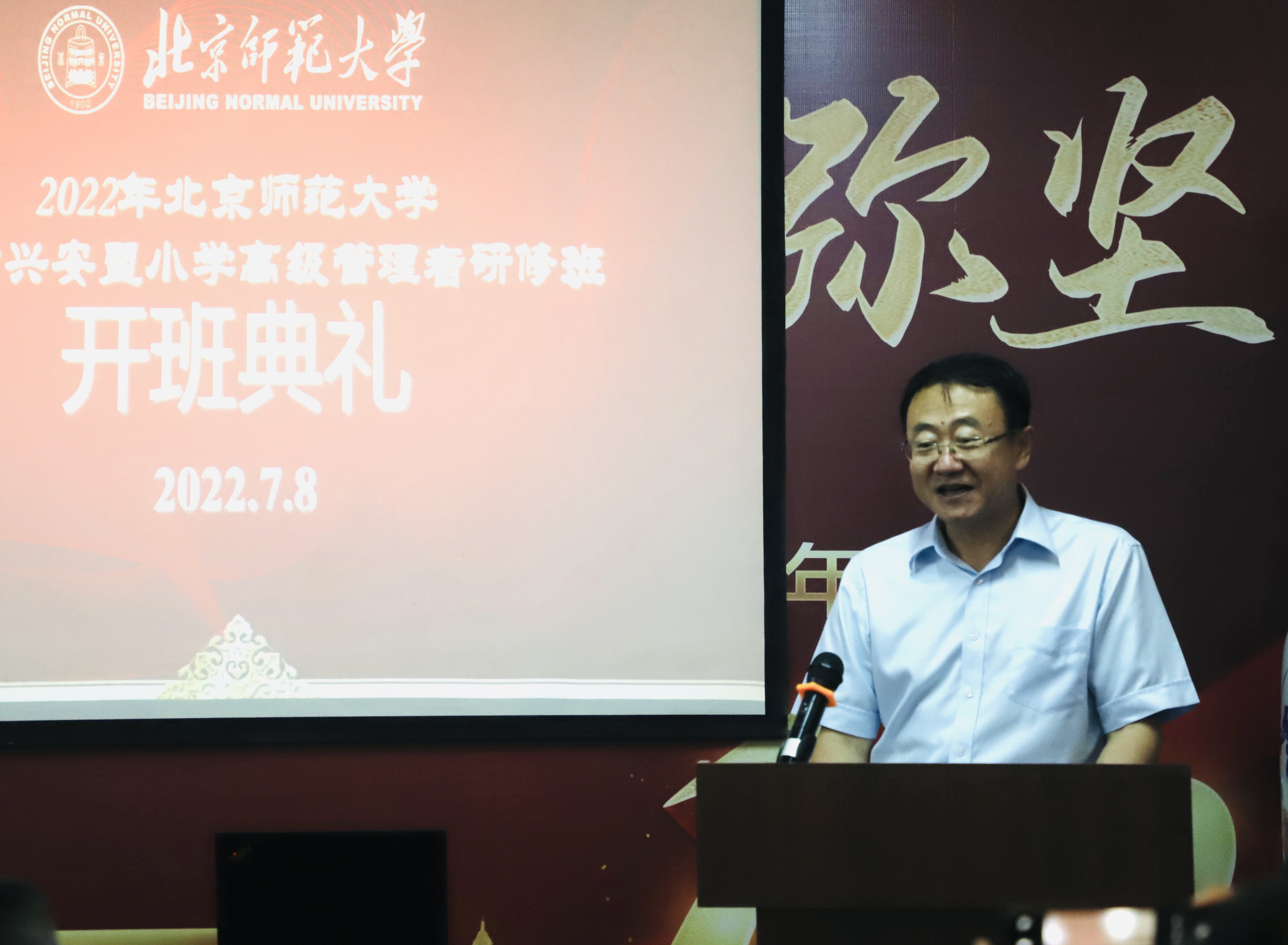 2022年7月8日上午,北京师范大学-内蒙古兴安盟小学高级管理者研修班开班典礼在北京举行。内蒙古自治区兴安盟教育局党组书记、局长朱宝江,教师工作科科长王俨辉,办公室主任唐鹰,办公室领队李健男,北京师范大学文学院党委书记康震,发展与合作中心执行主任向飞、副主任张帆出席了此次典礼。32位来自内蒙古兴安盟的小学校长和教学管理干部参加典礼,典礼由发展与合作中心秦中慧主持。
