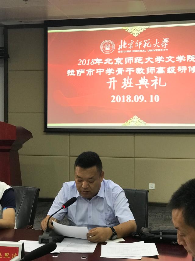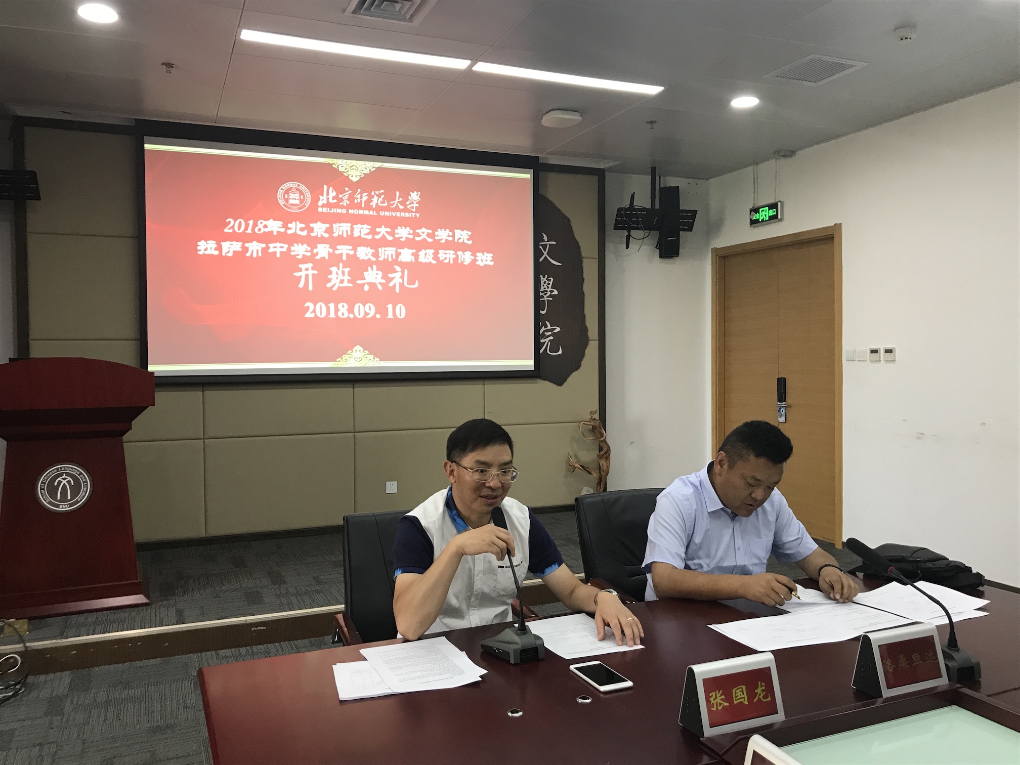 2018年9月10日星期一上午八时三十分,北京师范大学文学院-拉萨市中学骨干教师高级研修班开班典礼于北京师范大学主楼C5049顺利召开。拉萨市教育局受援办主任洛桑旦达、北京师范大学文学院发展与合作中心主任张国龙教授及拉萨教育局选派的30位中学骨干教师出席了此次开班典礼。