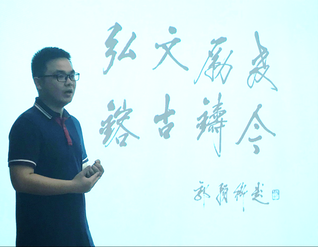 随后,黎中正老师向各位老师介绍了北师大文学院的悠久历史和深厚底蕴,并指出北师大文学院对当今语文教育乃至整个教育领域都有着巨大而深远的影响。为响应党中央关于弘扬和传承中华优秀传统文化的号召,依托文学院雄厚的科研实力、一流的专家团队,文学院面向中小学生以及中小学教育界推出了“青春国学计划”。随后详细介绍了“青春国计划学”的实施方案、实践成果与课程体系,让各位老师了解到北师大文学院目前已经与十几所中小学建立了长效的合作机制,并构建以诗词吟唱、民俗礼仪、经典阅读与写作、古代汉字与书法四门传统文化课为主体的课程体系,在中国高校中开创了让优秀传统文化走进中小学校园这一“师古而不复古”的独特路径。最后,黎中正老师热情地欢迎并号召各位老师积极加入到“青春国学计划”中来,共同为弘扬优秀传统文化,发展教育事业贡献力量。