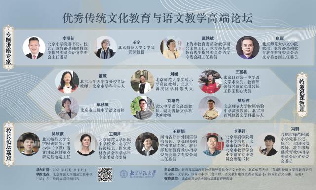 2021年12月18日至19日,“优秀传统文化教育与语文教学”高端论坛在北京师范大学附属实验中学顺利举行。本次论坛由教育部基础教育教学指导委员会语文专委会和北京师范大学联合主办。教育部基础教育司司长吕玉刚,教育部基础教育司教学与装备信息化处副处长赵宇,教育部基础教育教学指导委员会语文专委会主任委员、北京小学党委书记兼校长李明新,北京师范大学副校长张凯,北京师范大学附属实验中学党委书记陈国才等嘉宾出席开幕式。北京师范大学文学院党委书记康震主持开幕式。来自全国各地6万余人次中小学教师和教研员通过线上直播方式共同参与本次论坛。