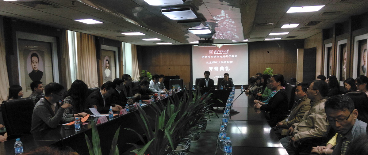2015年5月12日上午8:30,北京师范大学河南省对口协作地区骨干教师培训班开班典礼在励耘报告厅举行。河南省副总督学吴廷伟厅长、河南省教育厅师范处杨永盛副处长、河南省教育厅发展规划处刘振海副处长、河南省教育厅职称教处张家成副处长、北京市教育委员会办公室王力志副主任、北京市支援合作办智力支援处贺爽副处长、北京师范大学继续教育学院吴圣谷副院长、北京师范大学文学院党委书记王立军教授、文学院发展合作中心副主任陈珊老师、继续教育学院项目负责人赵雷、邓宇林老师出席了此次典礼。典礼由北京师范大学文学院院长助理、发展与合作中心主任张国龙副教授主持。