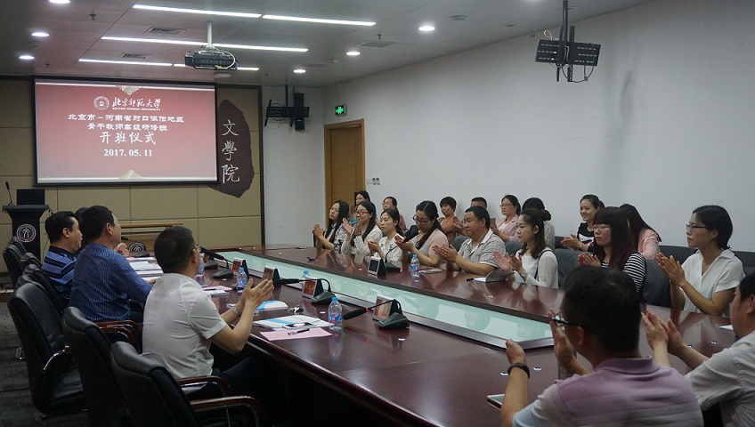 2017年5月11日上午8:30,北京市-河南省对口协作地区骨干教师高级研修班开班典礼在北京师范大学文学院举行。河南省教育厅师范处副调研员肖向毅、河南省教育厅发展规划处副处长刘振海、北京市教委办公室副主任王力志、北京师范大学文学院副院长张清华教授、北京师范大学文学院院长助理、发展与合作中心主任张国龙副教授出席了此次典礼。典礼由北京师范大学文学院发展与合作中心执行主任向飞主持。