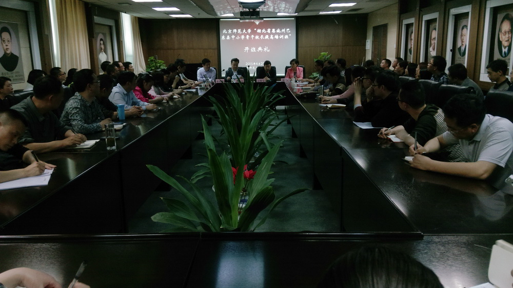 2015年4月25日,为期6天的北京师范大学湖北省恩施州巴东县中小学骨干校长提高培训班在北京师范大学文学院励耘报告厅拉开了帷幕。开班仪式历时1个小时,由文学院发展与合作中心主任张国龙老师主持,文学院院长过常宝教授、北京市教委办公室副主任王力志、巴东县委副书记郭玲、培训班总班主任沿渡河镇罗溪坝初中校长李昌玉、学员代表绿葱坡镇中心小学副校长袁庆椿先后做了精彩的发言。