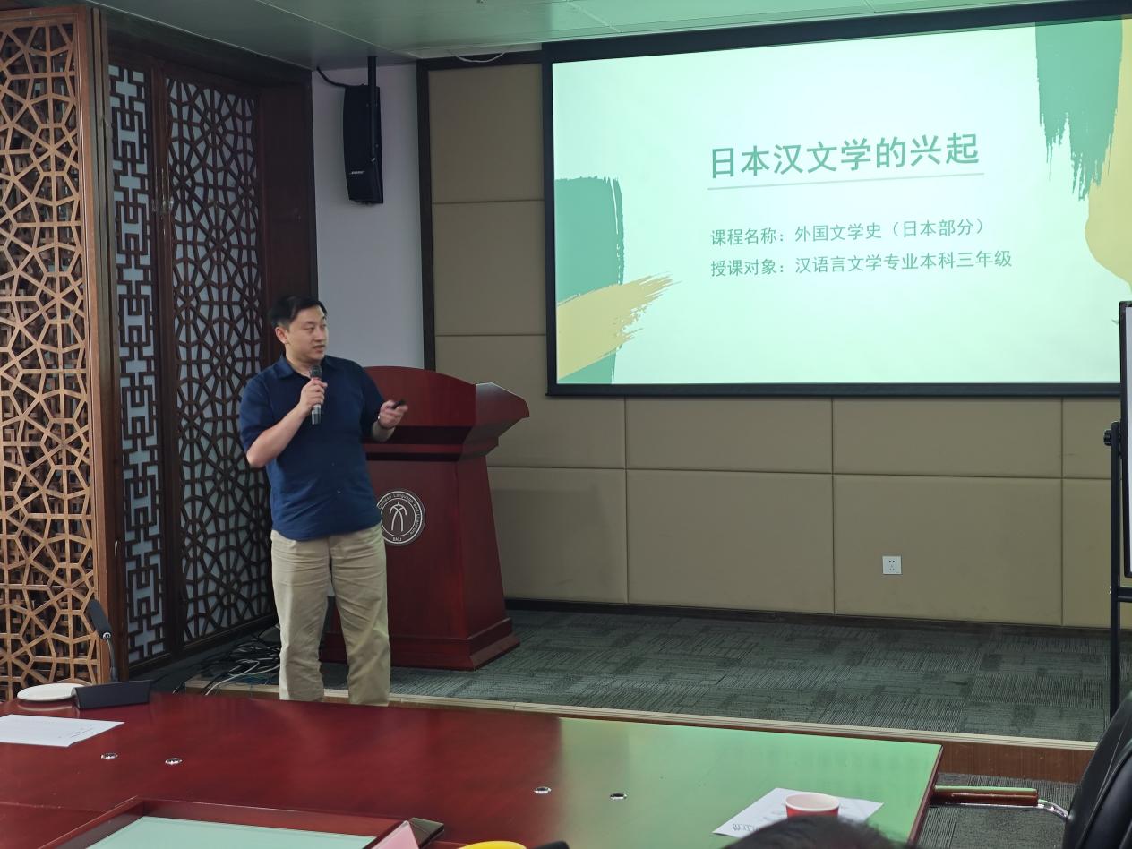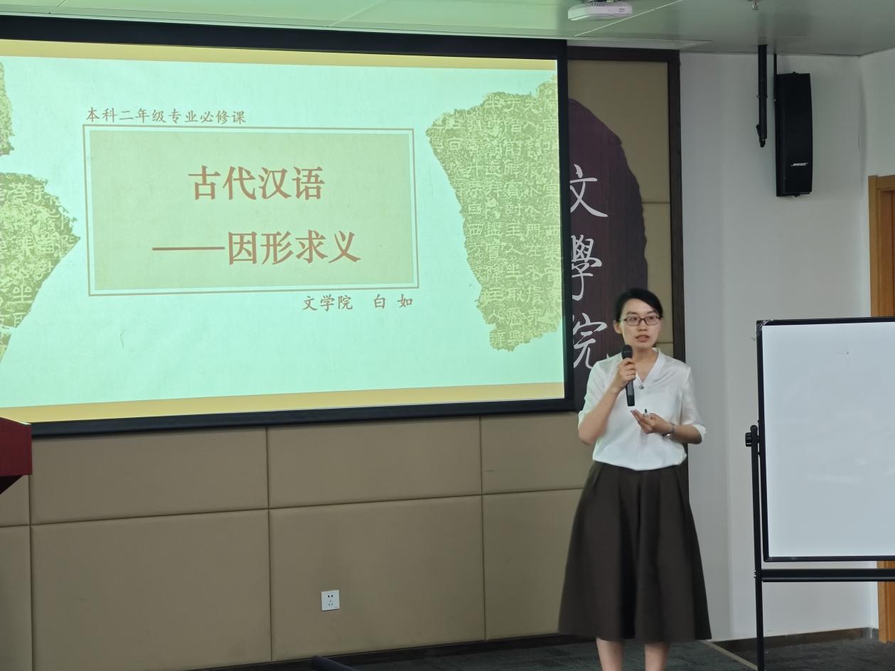 在比赛环节,青年教师们展示了各自独特的教学风格和扎实的教学基本功。钟蔚苹老师讲述了汉语的文白异读,通过深入浅出的方式阐述了文白异读现象;白如老师以因形求义为主题,巧妙地将汉字结构与词义联系起来;乐曲老师则介绍了日本汉文学的兴起,阐释了文化传播的历史;曾静涵老师对语法的概念进行了辨析,讲述了语言学的基础;任刚老师通过西厢故事与张生形象变化的讲解,展示了文学作品中人物塑造的丰富性;刘一昕老师则结合有关的案例,讲解了戏剧文学的概念。