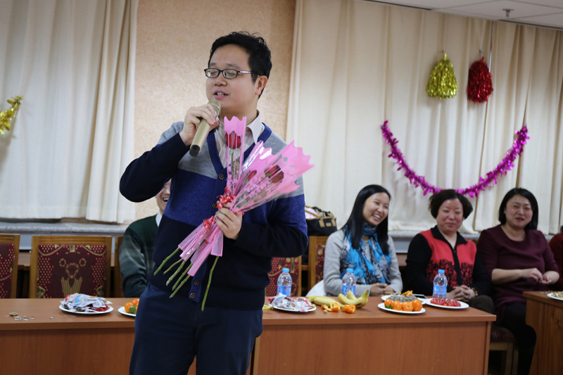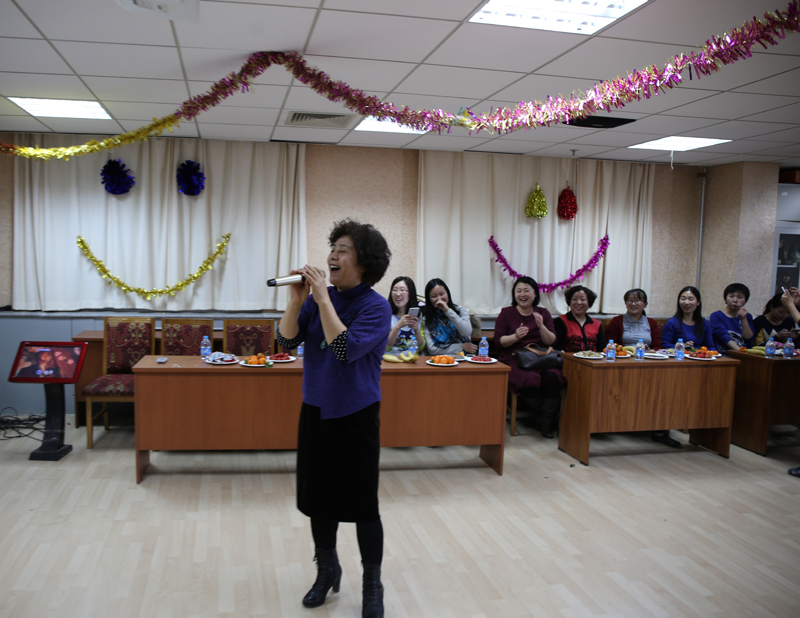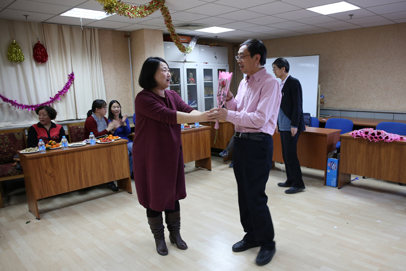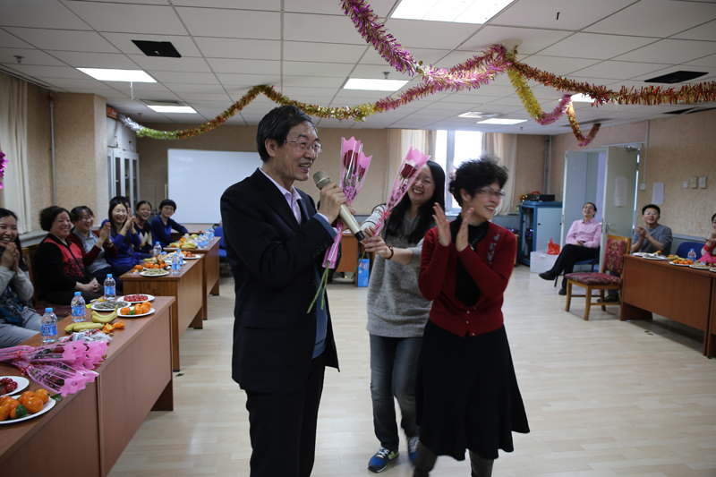 下午4点半,文学院工会活动室(前主楼B708)被布置的温馨浪漫,颜色亮丽的拉花遍布全场,鲜艳欲滴的红玫瑰散发着迷人的香气,桌上摆满了品种繁多的甜点、小吃、水果。随着欢快的背景音乐响起,在文学院分党委书记王立军、院长过常宝和院工会主席周晓文的带领下,文学院的各位男神女神悉数到场,演唱会就此拉开了序幕。各位男老师们跃跃欲试,准备一展歌喉。李国英教授的一曲《女人花》开场,恰到好处地烘托了三八妇女节的节日氛围,赢得了在场女老师们献上的束束玫瑰花;王立军教授用国语版和张哲俊教授用日语版同唱《北国之春》,可谓珠联璧合;院办马然主任标准的“周董式”发音的《发如雪》、周士宏老师粤语版的《偏偏喜欢你》、谢琰老师改良的二人转版《大约在冬季》、李小龙老师的款款情歌《信仰》征服了全体老师,博得了热烈掌声。男老师们的珠玉在前,女老师们也巾帼不让须眉,赵曦老师的京剧《贵妃醉酒》百转千回,抑扬顿挫;张燕玲老师的《甜蜜蜜》柔情似水,完全不亚于原唱。伴随着悠扬的歌声,老师们纷纷起舞。刹那间,歌婉转,舞翩跹,院工会活动室内满是一派和谐愉快的氛围。