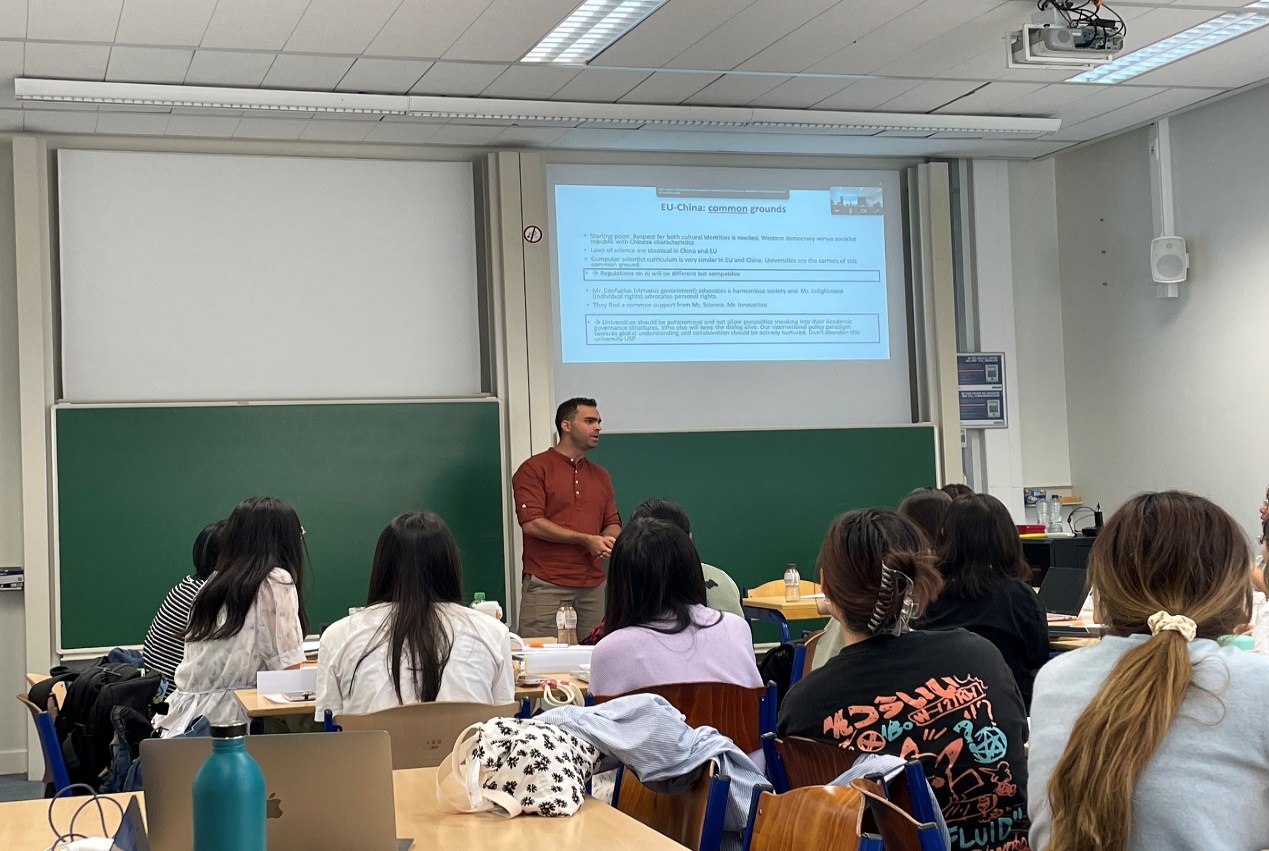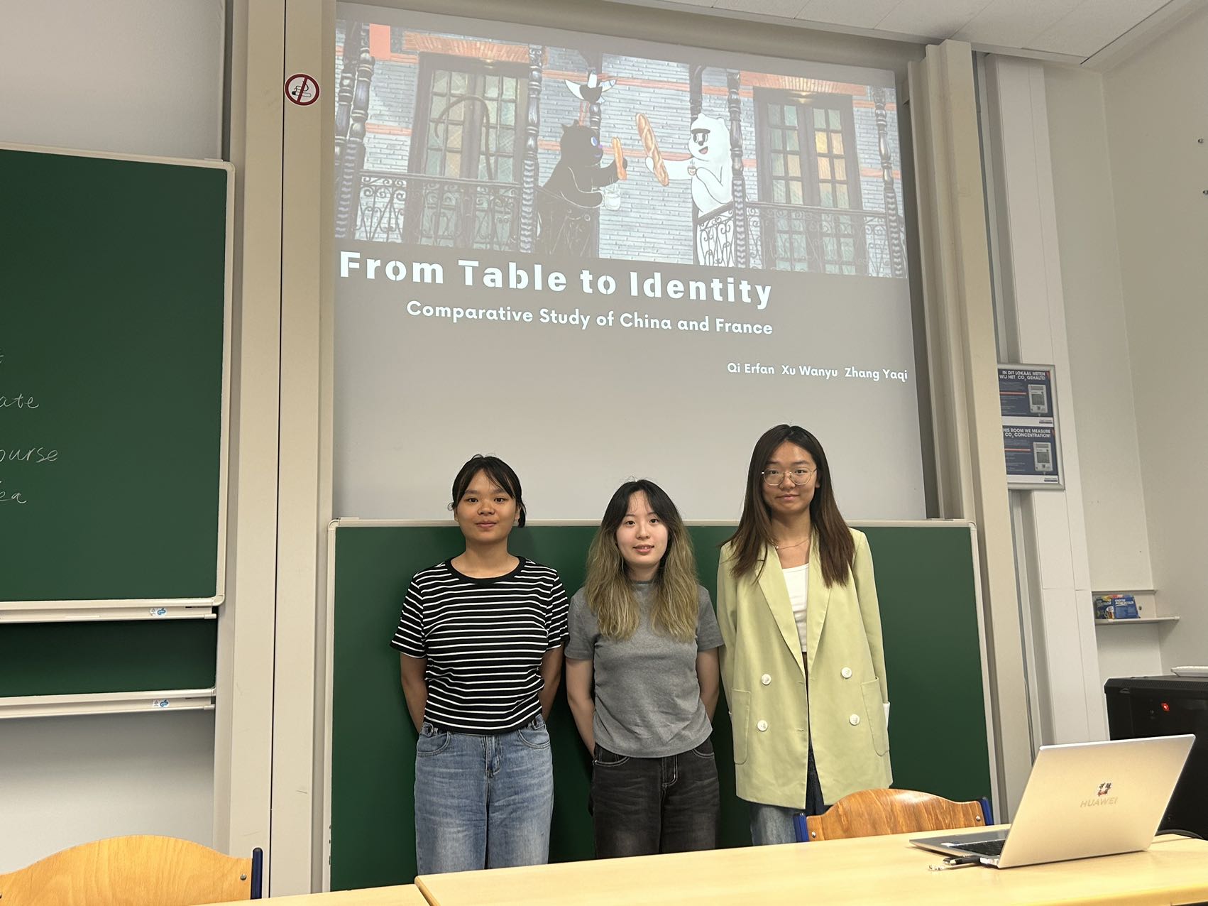 国际课程班采取分组研讨与合作的形式进行交流。同学们以小组为单位,围坐在一起,进行自我介绍和实时互动。最终的课程成果展示方式也采取了小组合作完成并汇报的形式。同学们彼此之间的距离逐渐拉近,本硕博的学制壁垒也被打破,加深了彼此之间的了解,提升了集体协作的意愿和能力。在最后的小组成果展示环节,各组分别围绕中欧音乐艺术节的比较、东西方绘画方式的比较、中欧女性生活方式比较、中法餐饮文化比较、中西“幽默”概念比较、中欧博物馆的比较、比利时的民族国家概念等话题,进行成果汇报,并在老师的指导下,高质量地完成了课程论文。