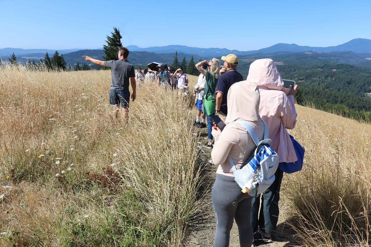 在丰富多彩的课程之外,研习营还举办了一系列田野调查和专家座谈活动,帮助同学们深入了解美国文化与社会。7月14日上午,同学们前往科瓦利斯附近的菲顿格林自然区(Fitton Green Natural Area)开展田野调查,眺望远处太平洋海岸山脉的美丽风景,了解当地独特的气候特征与植被特点。下午,同学们来到农民集市(Farmer’s Market),品尝蓝莓、樱桃等特色农产品,感受热烈愉快的乡村氛围,对科瓦利斯的风土人情有了更丰沛的体会。
