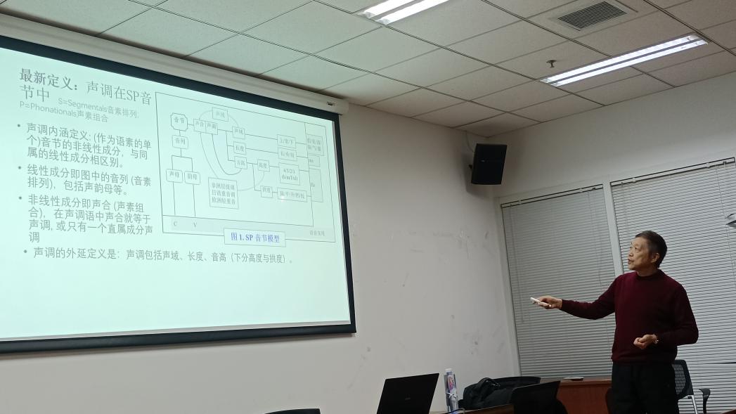 2024年12月18日晚,江苏师范大学语言科学与艺术学院特聘教授朱晓农在文学院5045会议室带来讲座“声调认知的演进”。讲座由北京师范大学文学院理论语言学所许小颖老师主持。北京大学张静芬老师、中央民族大学段海凤老师、中国政法大学曹洪林老师、北师大胡佳佳老师、孟跃龙老师、周士宏老师、汪高武老师、钟蔚萍老师、余德江老师等数十名师生参与讲座。