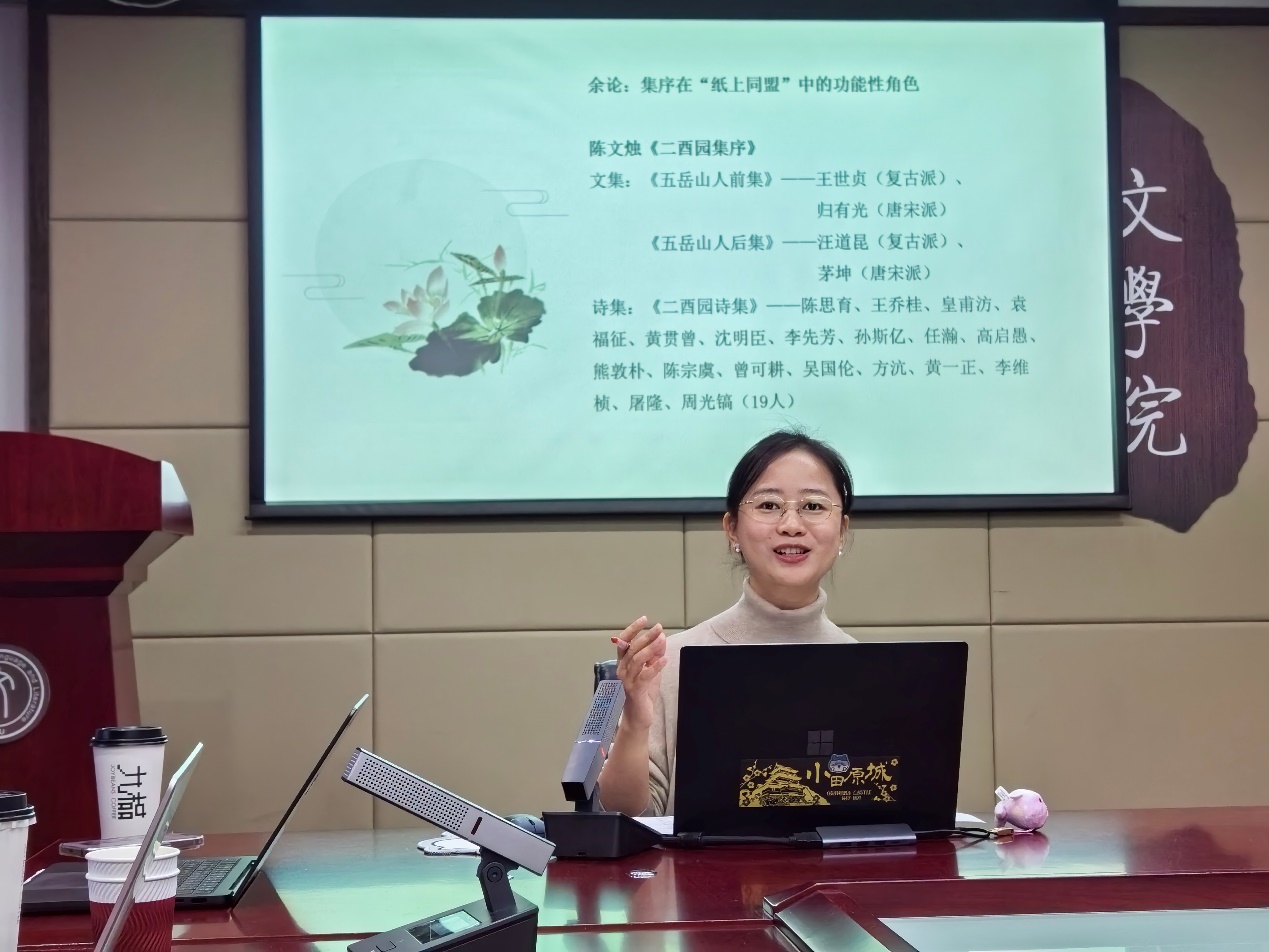 上海外国语大学中文学院胡媚媚主要关注清代文人的结社活动及诗学观念。“社”作为级别很高的文学活动,参与者表现出相近的诗学宗尚和审美追求。清代诗社数量很多,形成了稳定的诗人群体,社诗总集数量也远超前代。胡媚媚进而陈述了清代诗社的基本面貌和结社方式,涉及社诗总集、结社主体、诗歌创作、唱和形式等等。清初文人常常通过集体创作进行交游、学习,再从中脱颖而出。大体而言,清诗创作呈现出个性被群体性笼罩、遮盖的倾向。至于功能性书写,胡媚媚认为清代社诗创作的功能性并不明显。明末清初的结社带有政治抗争性,随着遗民群体的消失,诗社也很快转向文学性、艺术性、娱乐性更突出的活动。不过,诗社总集的序跋的确包含诸多功能性书写。最后,胡媚媚借助具体事例,进一步阐释了清代结社集会对诗歌题材、诗学观念和地域文学传统的形成等多方面的影响。
