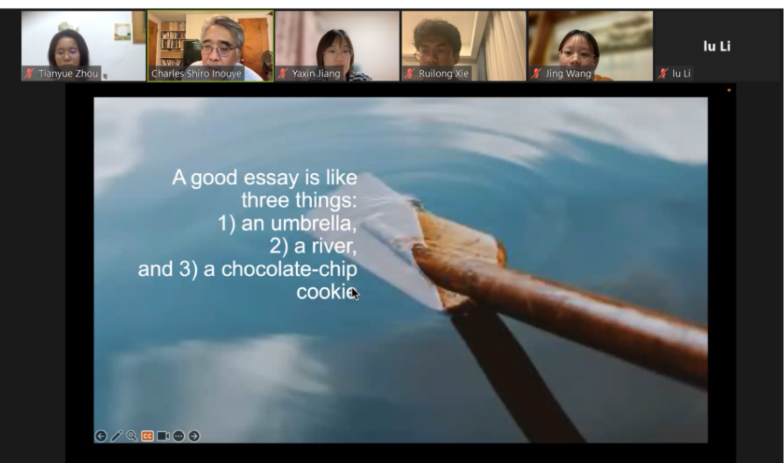 7月 24 日,开班仪式以zoom网络会议方式举行,由塔夫茨大学Aida Vidan教授主持。塔夫茨大学国际文学与文化研究系主任Charles Shiro Inouye教授出席,John Lehman博士和课程助教李时君同学参加了开班仪式。Aida Vidan教授简要介绍了本次暑期课程的缘起和日程安排,并详细介绍了授课教师的研究方向。随后,同学们用英语进行了自我介绍,表达了自己对课程的理解与期待。