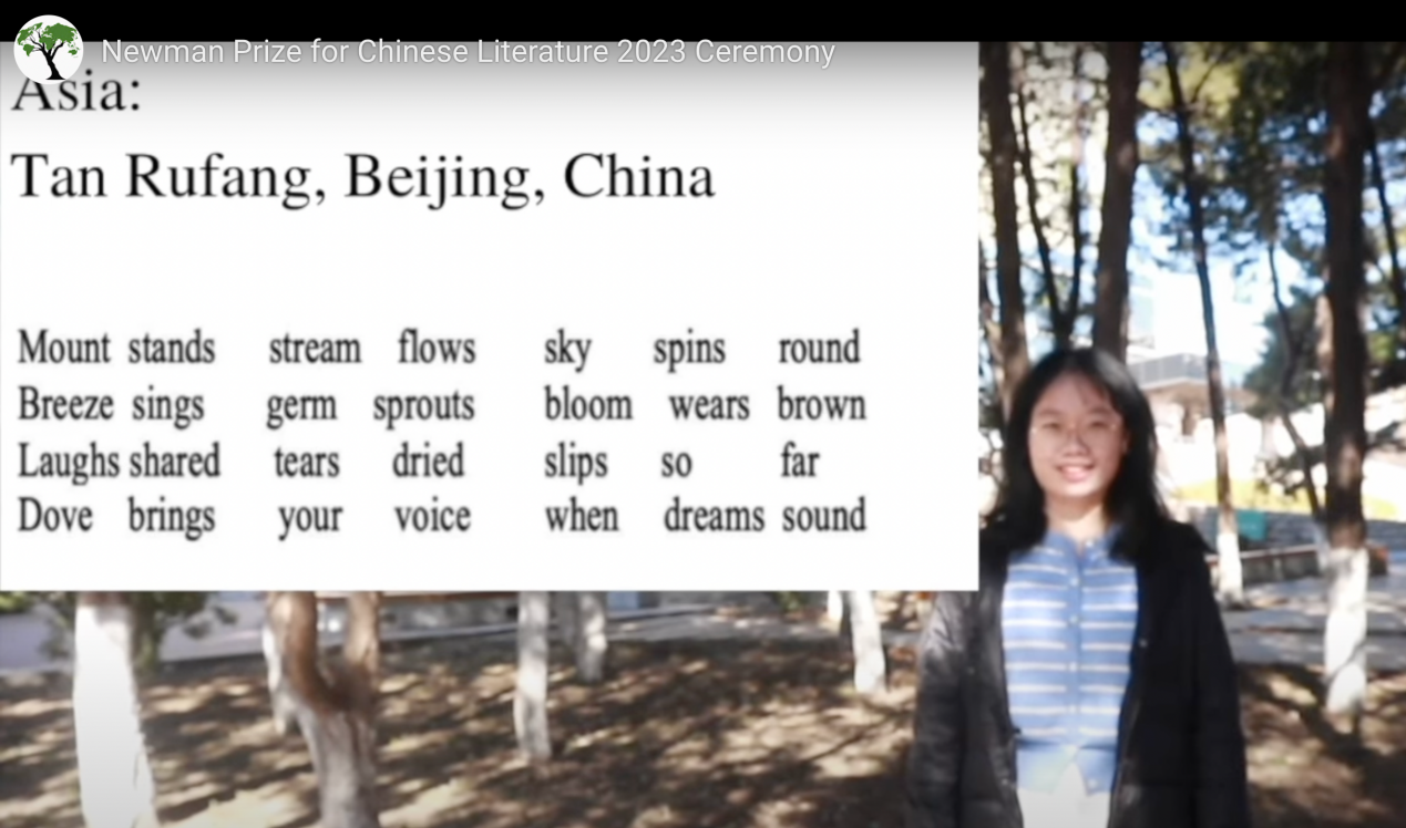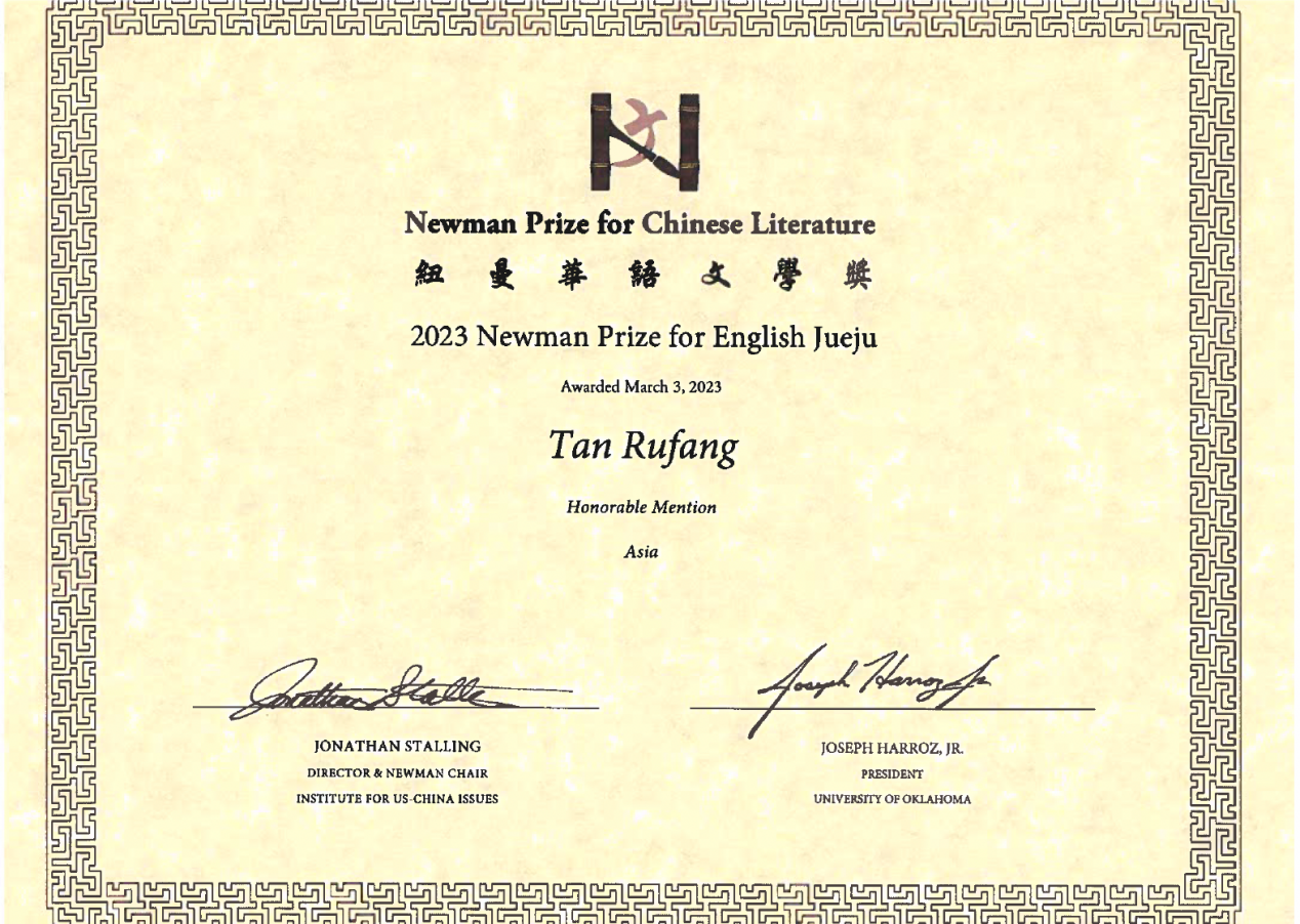 2023年3月22日,第六届纽曼英语绝句奖(Newman Prize for English Jueju)在美国俄克拉荷马大学揭晓。本届纽曼英语绝句奖从全球几百首参赛诗歌中评选出6首获奖作品,10首提名奖作品。我院比较文学与世界文学研究所2021级硕士生谭茹方同学,以“古体”英语绝句(“Old Style” Jueju)荣获2023年度纽曼英语绝句提名奖。