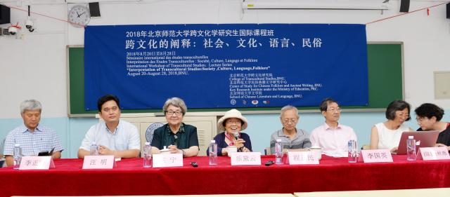 2018年8月20日上午,北京师范大学第四届跨文化学研究生国际课程班正式拉开帷幕。本次课程班由北京师范大学跨文化研究院、教育部人文社会科学重点研究基地北京师范大学民俗典籍文字研究中心、北京师范大学文学院联合主办。校主管单位领导,北京师范大学研究生院副院长汪明教授;主办单位领导代表、北师大民俗典籍文字研究中心主任李国英教授出席了开幕式。出席本届课程班开幕式的学术前辈和中外师资代表有:我国比较文学和跨文化研究事业的开拓者、北京大学跨文化研究中心主任、北京师范大学跨文化研究院名誉院长乐黛云先生,我国传统语言文字学家、北师大章黄学术研究中心主任、北师大跨文化研究院名誉院长、资深教授王宁先生,俄罗斯文艺学研究专家、北师大文艺学研究中心研究员、北师大学跨文化研究院学术委员会主任程正民先生,法国阿尔多瓦大学文本与文化研究中心主任、北师大跨文化研究院副院长金丝燕教授,北京师范大学跨文化研究院院长董晓萍教授,北师大跨文化研究院副院长李正荣教授。董晓萍院长主持开幕式。