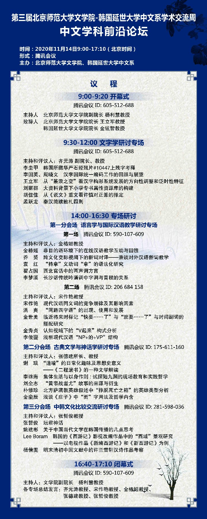 11月14日,由我院与韩国延世大学中文系联合主办的“第三届北京师范大学文学院-韩国延世大学中文系学术交流周·中文学科前沿论坛”成功举行。来自两院系的28位中韩学者和博士研究生分为五个专场,在一整天的时间里,通过腾讯会议,围绕着文字学、古代文学和神话学、语言学和国际汉语教学以及中韩文化比较交流等学术领域,进行了在线论文发表和讨论交流。近300人次的听众参与了此次国际学术研讨活动。