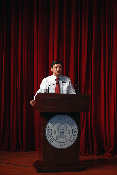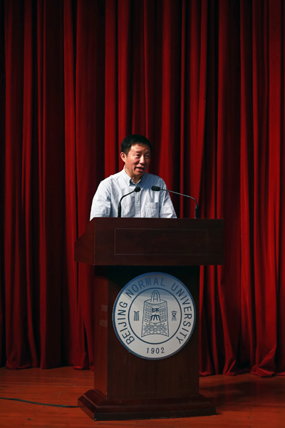 典礼在雄壮的国歌声中开幕。首先,院长过常宝教授热情洋溢地发表了题为《走进文学院》的致辞。他代表文学院全体教师对文学院迎来的430名新生表达了热烈的欢迎。过常宝院长从院训、人物、荣誉等七个方面回顾了文学院的发展历程和建设成果,他指出,北师大文学院是中国历史最悠久的文学院之一,它伴随着整个高等教育的发展历程,国家能够授予中文学科的所有荣誉和资格,北师大文学院都是第一批获得。在国际化发展方面,更是独立潮头。谈到院训“弘文励教,镕古铸今”时,他释义道,“文”是人之所以为人,社会之所以为社会的根基,它不仅支撑社会,也是个人的生命支柱。最后,过长宝院长表达了对提升学生国际视野的期望,并勉励新生要对文学院有信心,与老师一道为文学院的发展添砖加瓦,让北师大文学院成为大家骄傲而无悔的选择。