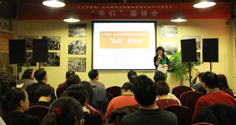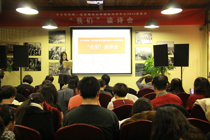 2014年12月20日,作为北京师范大学国际写作中心2014诗歌周最后一场活动“冬日的回响:‘我们’诗歌会”在老故事餐厅成功举办,依旧吸引了来自各界朋友们的光临,诵读出一曲冬日的强音。朗诵会在国际写作中心总干事苗绿女士的主持下进行,北师大国际写作中心执行主任张清华教授,著名诗歌理论家、首都师范大学吴思敬教授,中央民族大学敬文东教授以及“我们”诗社的多位诗人出席了本次诗歌朗诵会。本场诗歌会共分为五个回合。
