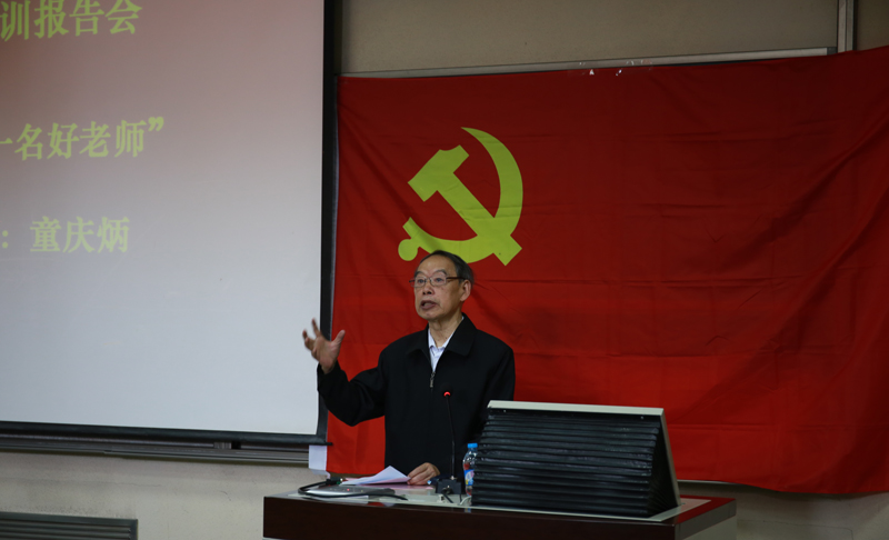 文学院党校成立仪式结束后,文学院资深教授童庆炳先生以《做四有好老师,为党和人民培育英才》为题做了首场培训报告。报告会持续了近两个小时,童先生在报告中结合自身的从教经历,以幽默风趣的语言阐释对“四有”好老师的理解。童先生的报告真诚又亲切,娓娓道来,让在场所有老师和同学都深受感染,场内数次响起热烈的掌声。作为一位有着60年党龄的老党员,童先生用自己亲身经历为“四有”好老师做了最生动的注解。