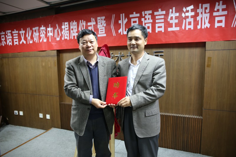 揭牌仪式由北京师范大学文学院分党委书记王立军教授主持,北京市语委办贺宏志主任、北京师范大学社科处范立双处长、北京师范大学文学院过常宝院长出席并致辞。北京语言文化建设研究中心主任、北京师范大学文学院语言学与应用语言学研究所所长张维佳教授代表中心发言,感谢北京市语委对中心的大力支持,并表示将充分发挥北京师范大学的学术优势,率领中心为北京文化事业的繁荣发展做出应有的贡献。揭牌仪式上,过常宝院长还代表文学院为贺宏志博士颁发了北京语言文化建设研究中心兼职研究员聘书。