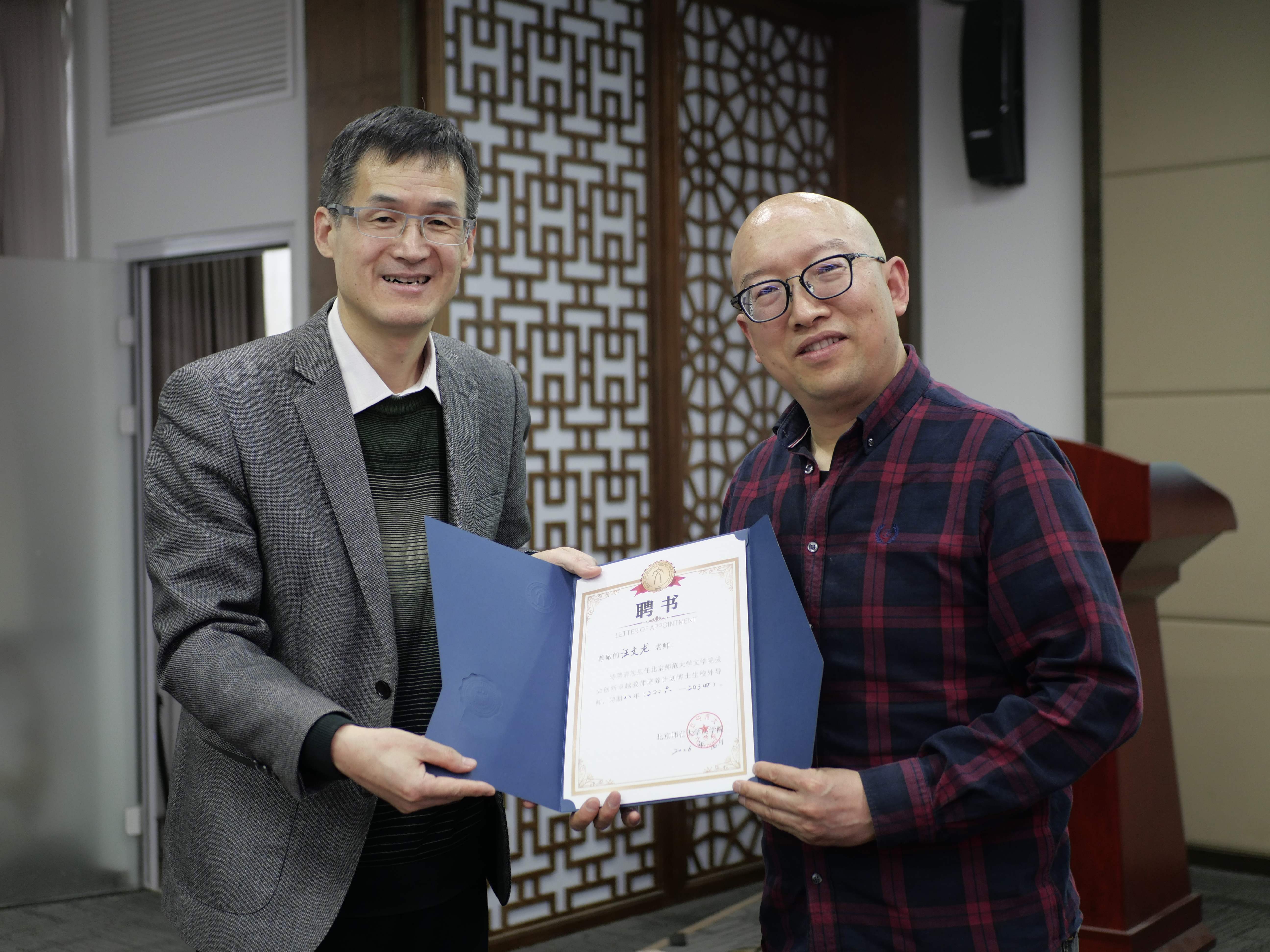 讲座正式开始之前,李小龙老师简要地介绍了汪文龙老师在中学语文教学领域的深厚积淀与资深地位,并代表文学院为汪老师颁发了校外导师聘书。