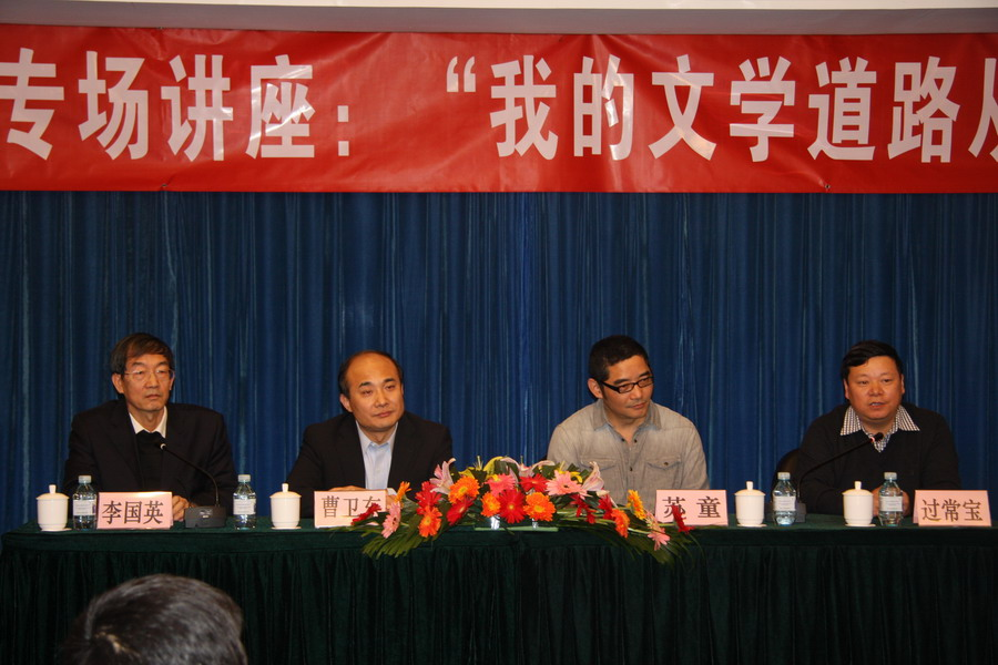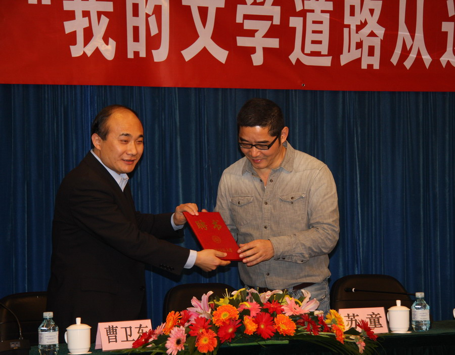 2012年12月10日下午,著名作家苏童受聘我校兼职教授仪式暨“莫言及北师大校友作家文学周”首场讲座举行。曹卫东副校长出席受聘仪式。文学院分党委书记李国英、院长过常宝、副院长张清华、副书记方红珊以及200余名师生参加了活动。