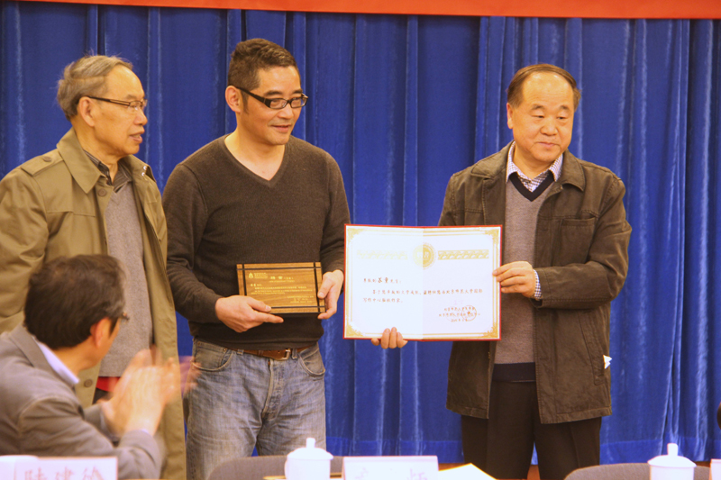 随后,董奇校长与莫言主任向苏童颁发驻校作家聘书。