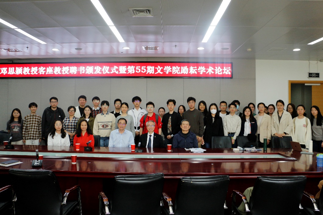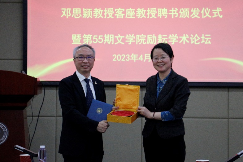2023年4月18日下午,我院在主楼C区5049报告厅举行邓思颖教授客座教授聘书颁发仪式暨第55期文学院励耘学术论坛。邓思颖教授为香港中文大学中国语言及文学系教授兼系主任、生成语法研究的著名学者。客座教授聘书颁发仪式由杨利慧副院长主持、王立军院长进行颁发,学术论坛由邓思颖教授主讲、王立军院长主持,我院刁晏斌教授、许小颖副教授、周士宏教授等语言学及相关专业的多名教师,以及50余名博硕士研究生和本科生,参加了聘书颁发仪式及学术论坛。