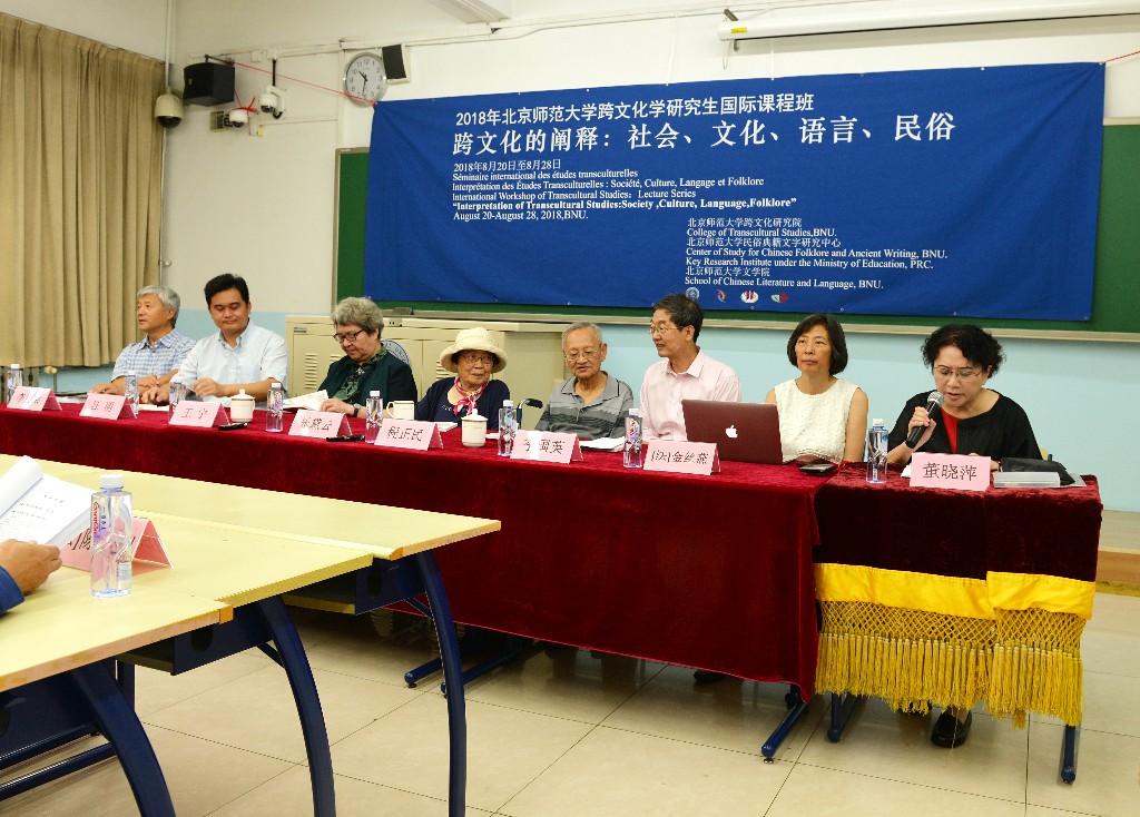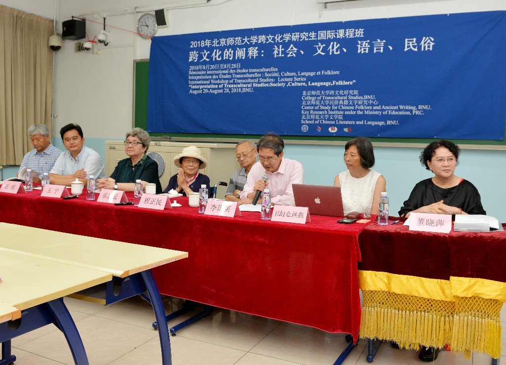 2018年8月20日上午,北京师范大学第四届跨文化学研究生国际课程班正式拉开帷幕。本次课程班由北京师范大学跨文化研究院、教育部人文社会科学重点研究基地北京师范大学民俗典籍文字研究中心、北京师范大学文学院联合主办。校主管单位领导,北京师范大学研究生院副院长汪明教授;主办单位领导代表、北师大民俗典籍文字研究中心主任李国英教授出席了开幕式。出席本届课程班开幕式的学术前辈和中外师资代表有:我国比较文学和跨文化研究事业的开拓者、北京大学跨文化研究中心主任、北京师范大学跨文化研究院名誉院长乐黛云先生,我国传统语言文字学家、北师大章黄学术研究中心主任、北师大跨文化研究院名誉院长、资深教授王宁先生,俄罗斯文艺学研究专家、北师大文艺学研究中心研究员、北师大学跨文化研究院学术委员会主任程正民先生,法国阿尔多瓦大学文本与文化研究中心主任、北师大跨文化研究院副院长金丝燕教授,北京师范大学跨文化研究院院长董晓萍教授,北师大跨文化研究院副院长李正荣教授。董晓萍院长主持开幕式。