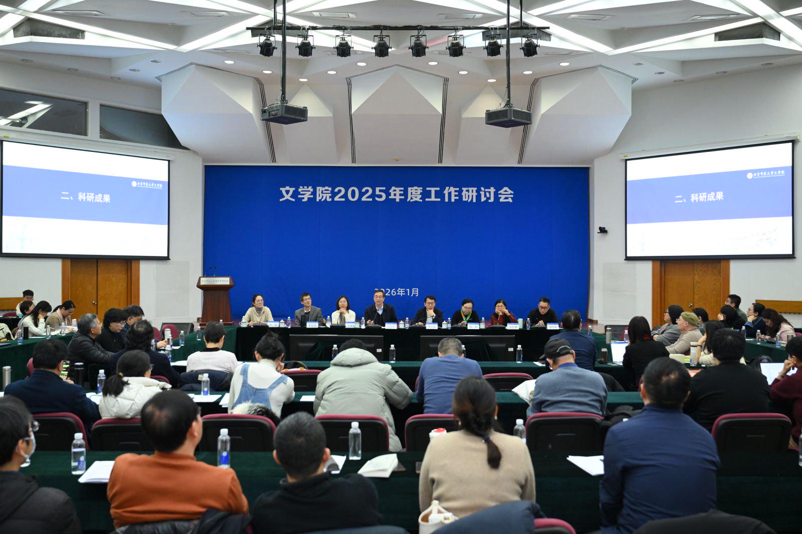 为全面总结回顾学院2025年度各项工作,科学研判与谋划2026年度重点任务。 2026年1月13日,北京师范大学文学院2025年度工作研讨会在海淀校园英东学术会堂召开。学院近百名教师参加会议。