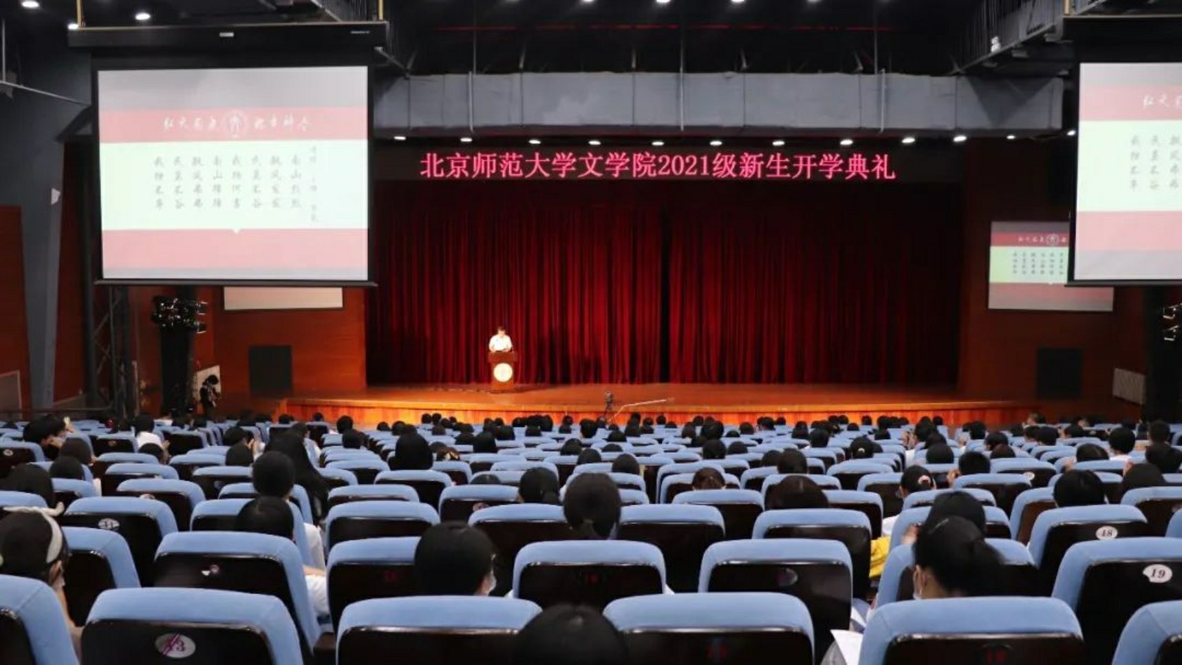 2021年9月9日晚,北京师范大学文学院在学生活动中心举行2021级新生开学典礼,北京校区与珠海校区的新生采用线上线下相结合的形式共同参与。