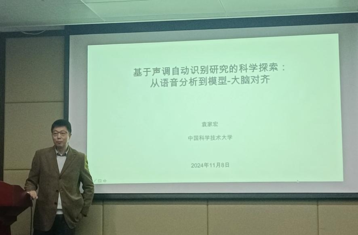 2024年11月8日下午,我院在主楼C区5045报告厅举行京师中文大讲堂第19场讲座,主题为“基于声调自动识别研究的科学探索:从语音分析到模型-大脑对齐”,主讲人为袁家宏教授。袁家宏教授是大数据语音学、人工智能语言学方向的著名学者,现为中国科学技术大学人文与社会科学学院教授。