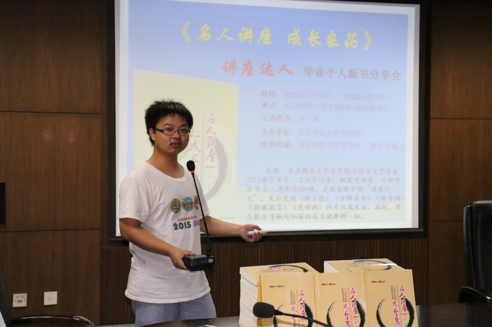 2015年7月13日晚七点,由北京师范大学文学院主办的“名人讲座成长良药——讲座达人毕业个人新书分享会”在北京师范大学主楼七楼励耘报告厅举行。