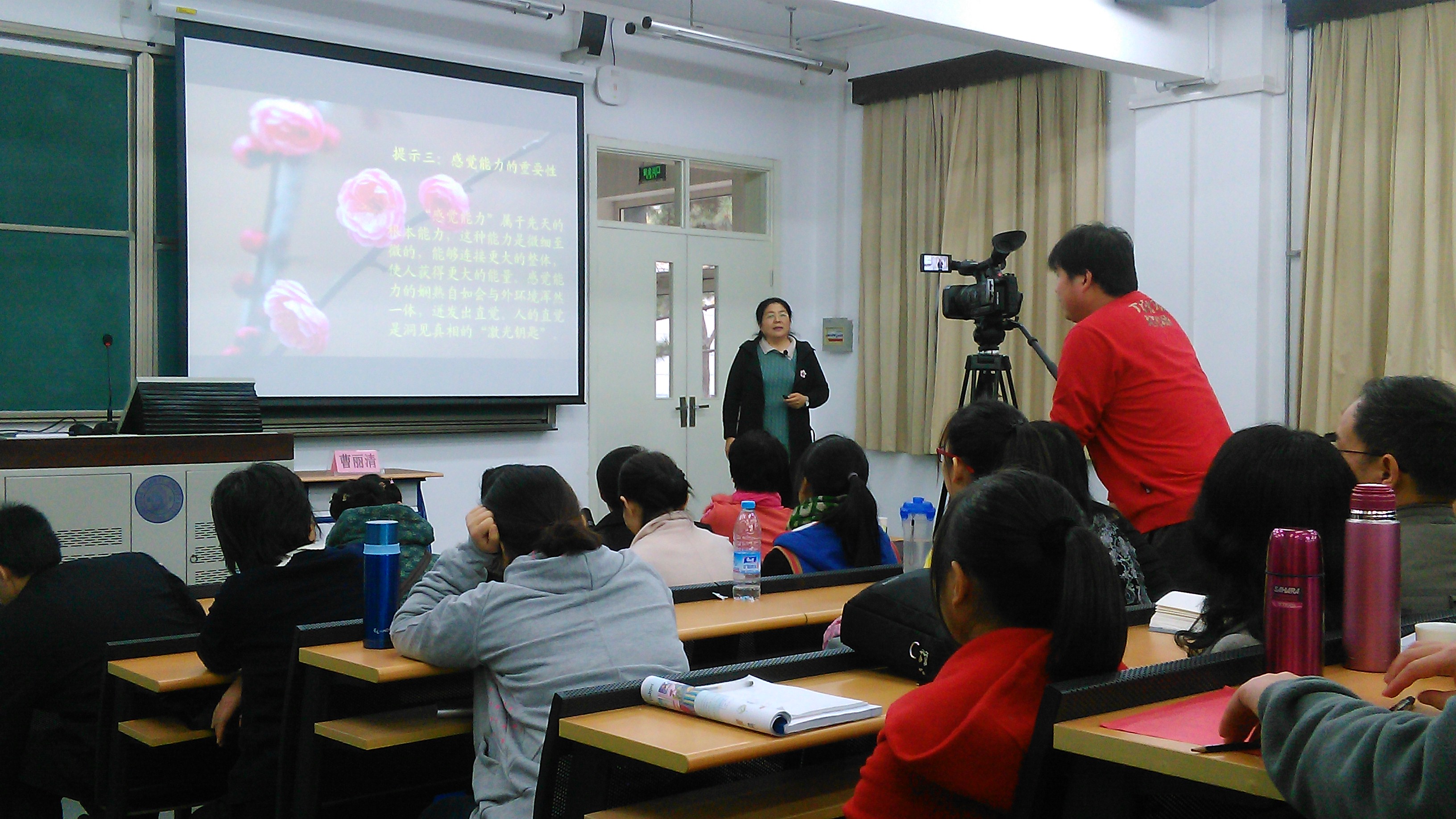 下午2:00,讲座正是开始。曹老师首先引导大家对自己进行一系列反思:“你真的想了解自己吗?”“你真的懂得自己吗?”“你真的能够接受自己吗?”“你真的很在乎自己吗?”老师告诉大家要学会真正的面对自己,要学会接纳自己的生命,因为我们所遇到的一切,没有好坏和对错之分,那只是生命自在的一种表达。我们要时时聆听生命给我们的暗示,而不应该下意识地回避那些我们不愿意接受的成分,寻找理由为自己开脱。曹老师强调,幸福是一种感觉,这种感觉与生俱来,是我们在后来的生活中失去了对世界的“感觉能力”,而关注于被动的“感受”。于是,在曹老师的引导下,大家闭上眼睛,慢慢去感受世界又回到自身,感觉为心灵开拓了空间,生命也变得伶俐轻盈、随性自如了。大家在曹老师的指导下有了很多感触,对生命和幸福有了更加深刻的理解和认识。中场休息时间,大家围绕在曹老师周围,纷纷倾诉自己的感触和困惑。曹老师耐心地开导大家。