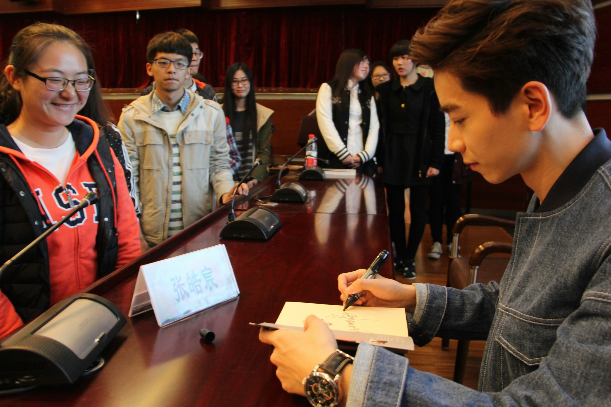 讲座的最后,张皓宸签售《我与世界只差一个你》一书并与文学院学生会工作人员合影留念。当日下午16时许,讲座在和谐愉悦的氛围中圆满结束。