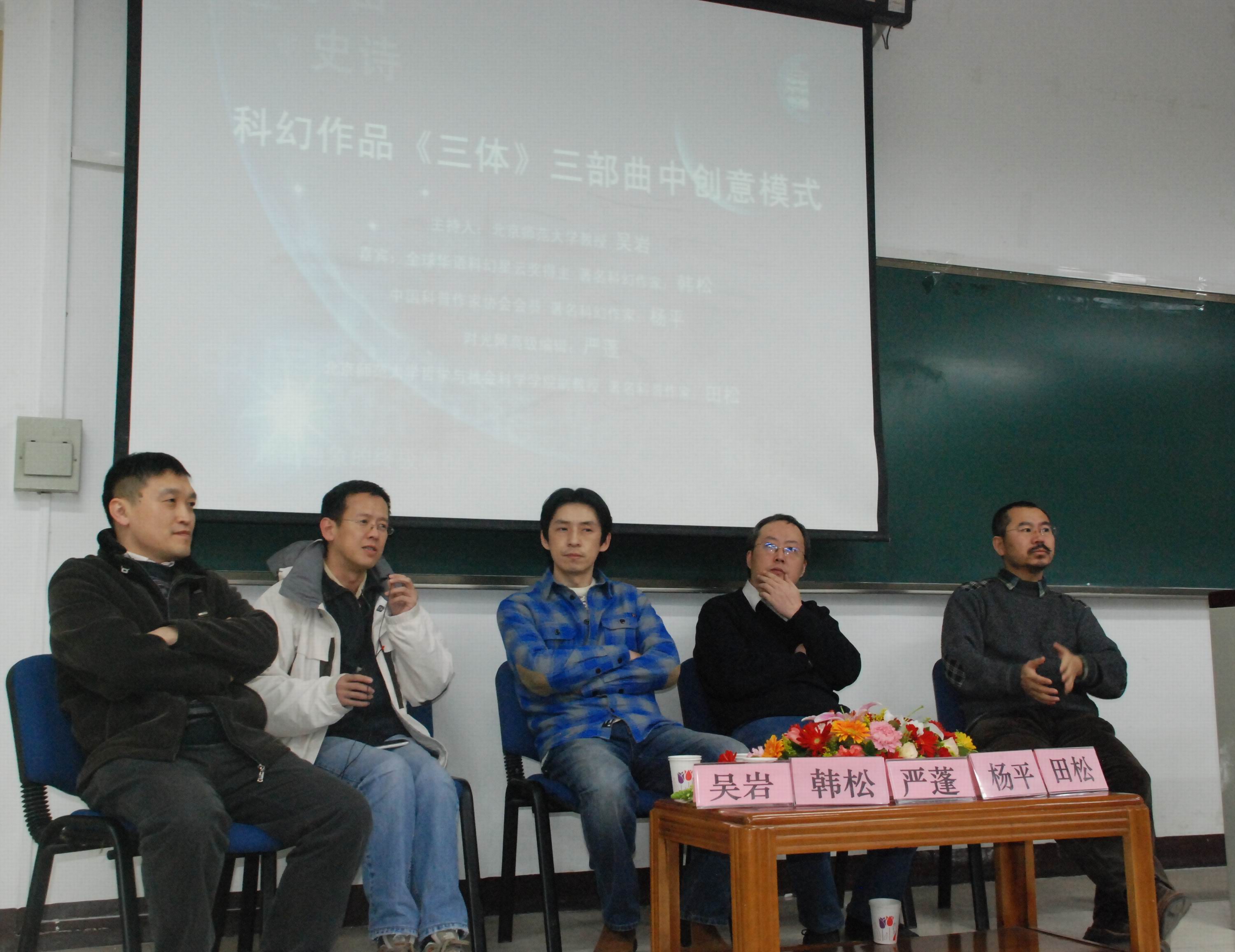 2011年12月15日晚,由北京师范大学研究生工作部和文学院研究生会学术部主办的 “治学•修身”论坛——《三体》三部曲中的创意模式,在北京师范大学教二101教室举行。到场的嘉宾有著名科幻作家韩松、杨平,时光网高级编辑、著名影评人严蓬,北师大哲学与社会学学院副教授田松等人。在北师大教育学部教授、科幻研究者吴岩老师的主持下,与会嘉宾妙语连珠,各自从不同的视角提出了自己的精辟见解。