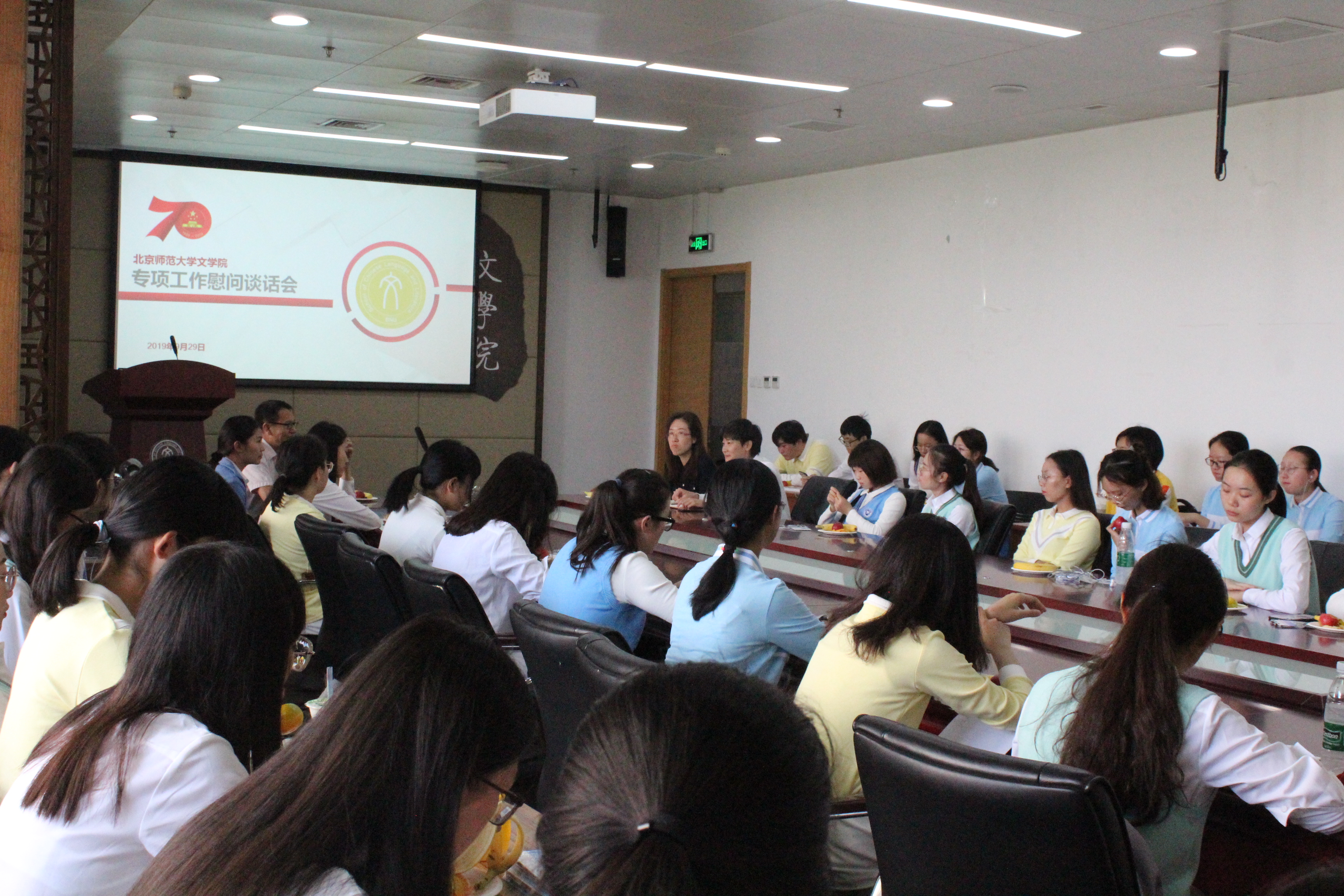 2019年9月29日上午,文学院国庆“专项活动”慰问座谈会于主楼C5049举行。文学院党委副书记周云磊老师、团委书记马琼老师、专职辅导员李晓倩老师、学工办李敬文老师出席了本次座谈会,参加本次慰问座谈会的还有国庆“专项活动”群众游行方阵的近80位文学院同学。