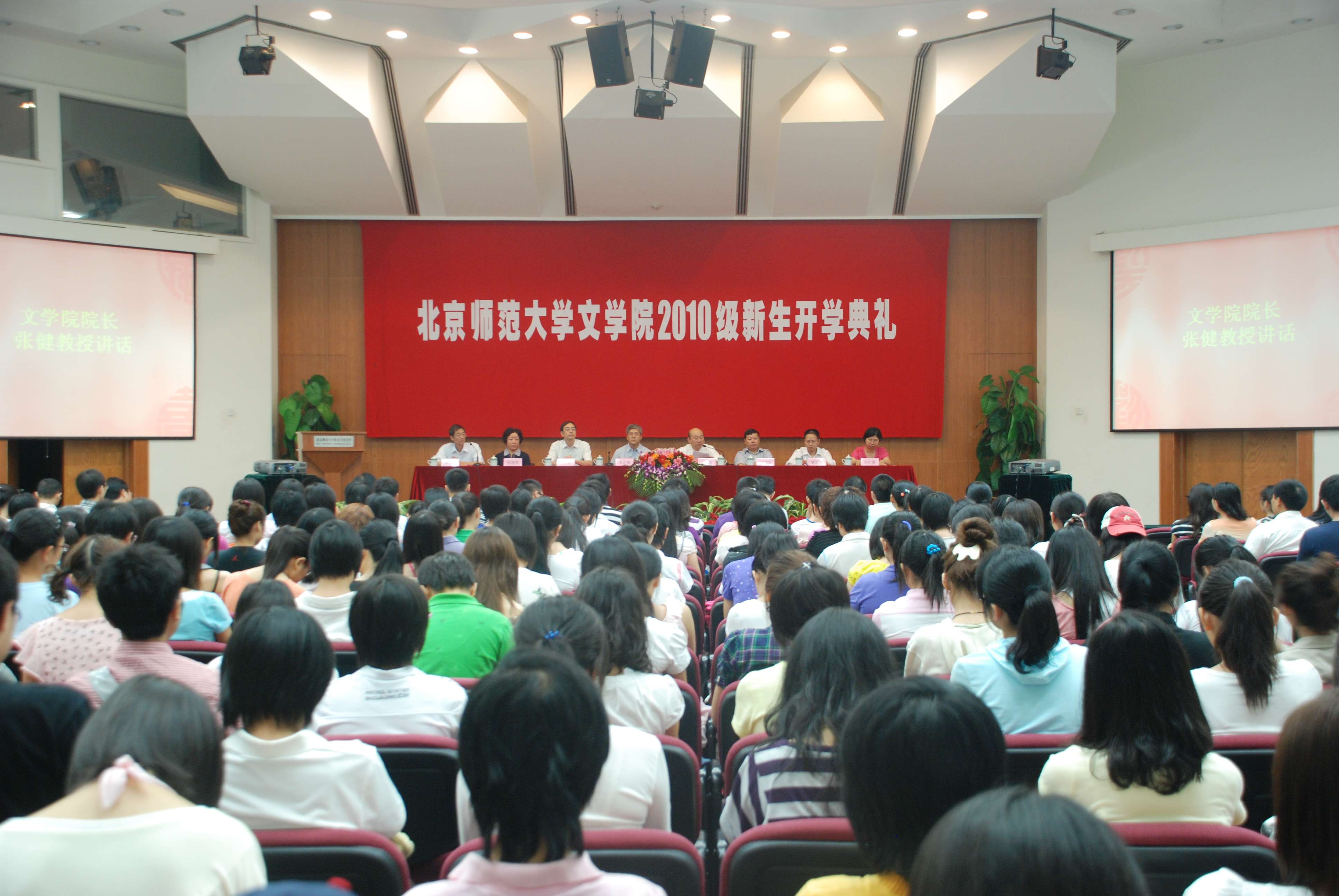 2010年9月15日上午,文学院2010级新生开学典礼在英东学术会堂隆重举行。2010级全体本科生、研究生以及留学生共500余人参加了开学典礼。文学院院长张健,副院长过常宝、王立军、姚建彬,院党委副书记张燕玲、方红珊等全体院领导和部分研究所所长、辅导员代表出席了典礼。典礼由文学院分党委书记李国英主持。